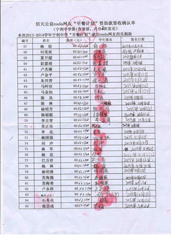 宁利中学,2013-2014年早餐计划第一次发款签收单