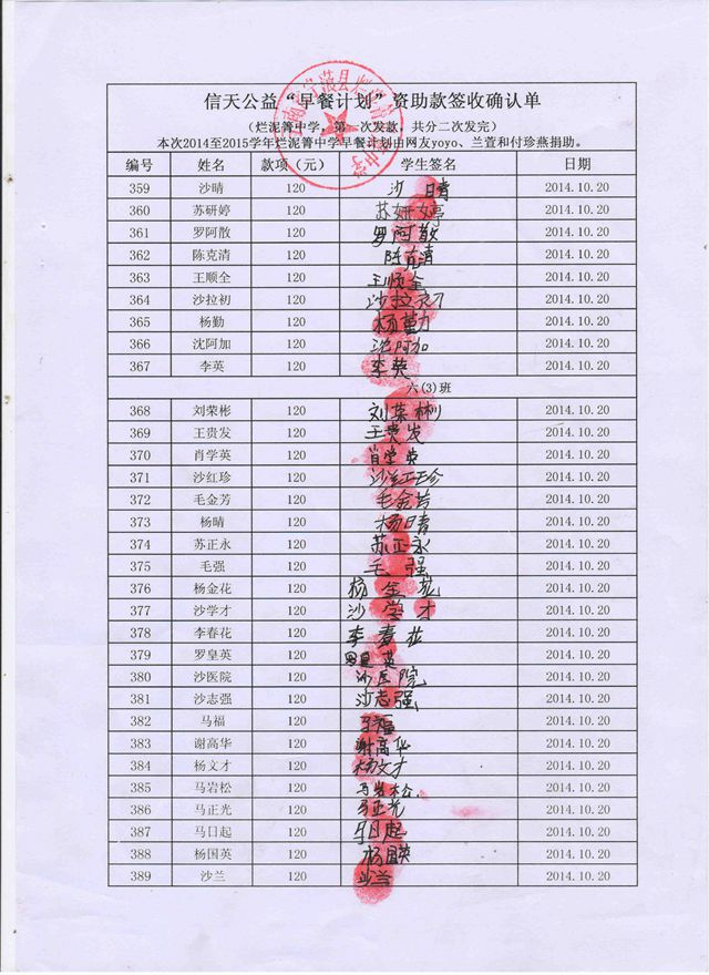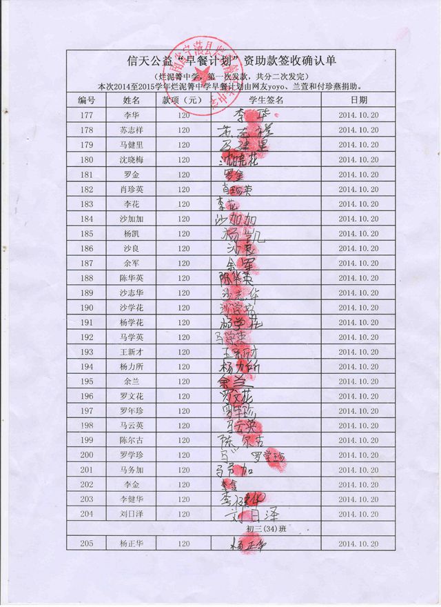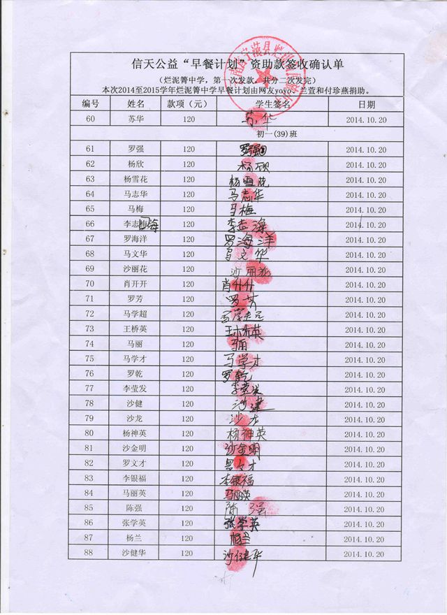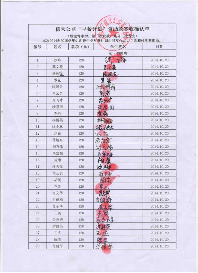 烂泥箐中学,2014-2015年早餐计划第一次发款签收单