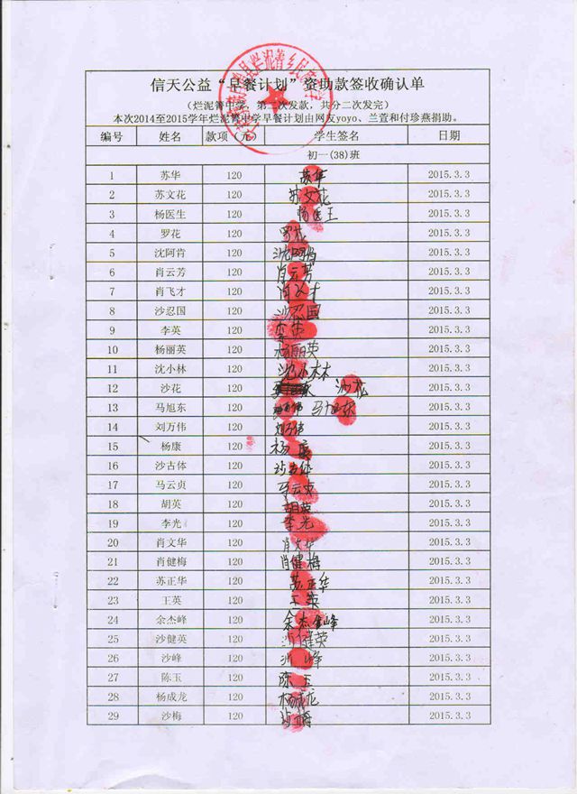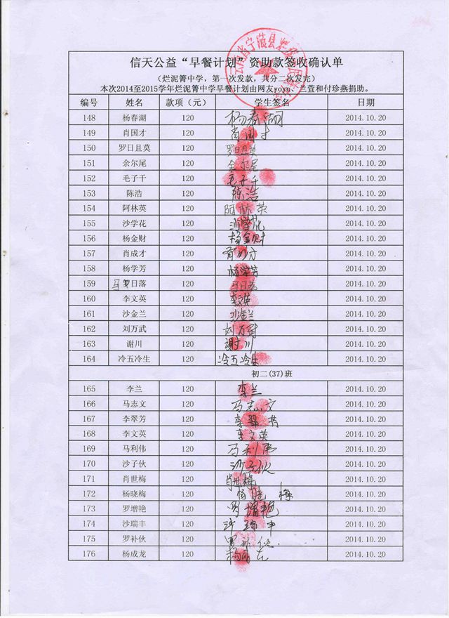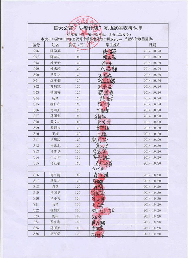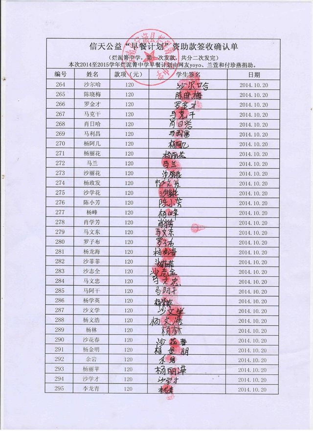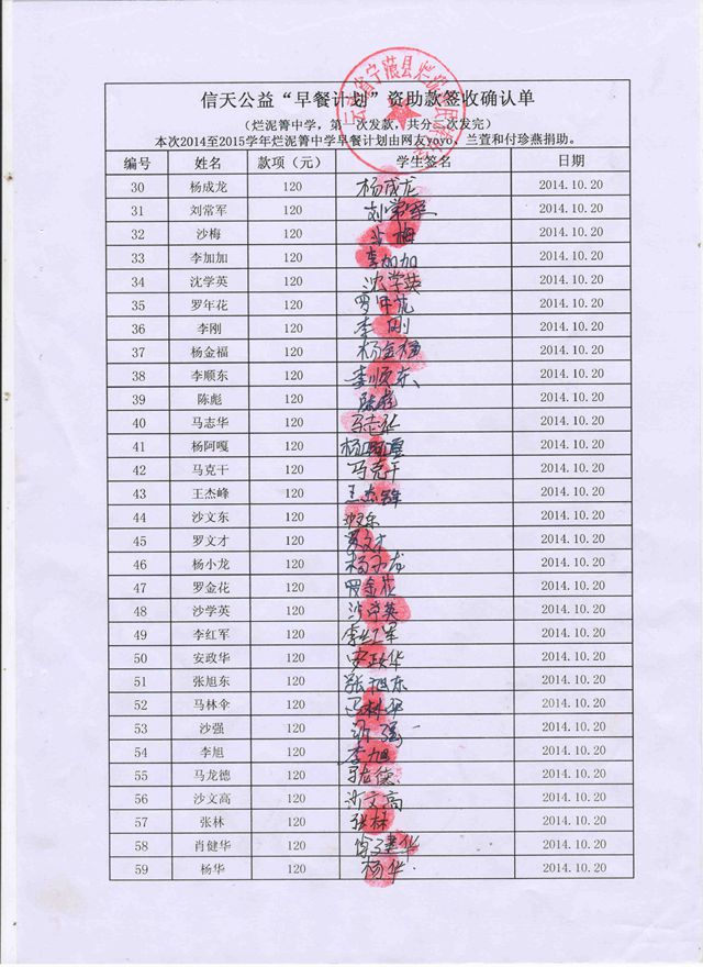 烂泥箐中学,2014-2015年早餐计划第二次发款签收单