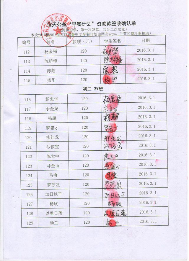 烂泥箐中学,2015-2016年早餐计划第二次发款签收单
