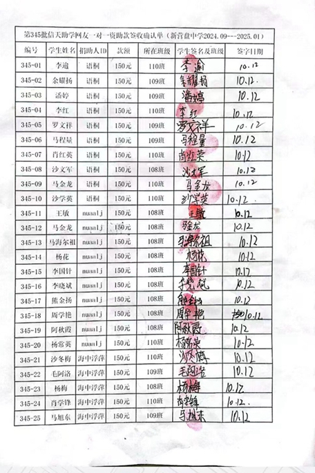 第345批新营盘中学(2025年3月到2025年7月)受助学生签收单