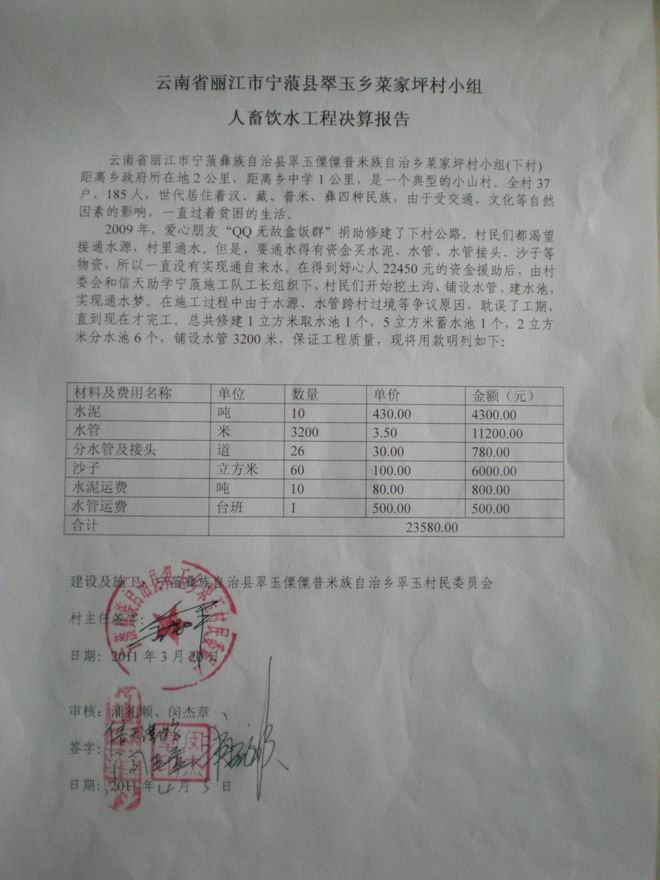 蔡家坪下村饮水工程总结算为:23580元,网友捐款22450.07元,不足金额1129.93元由当地自行解决。