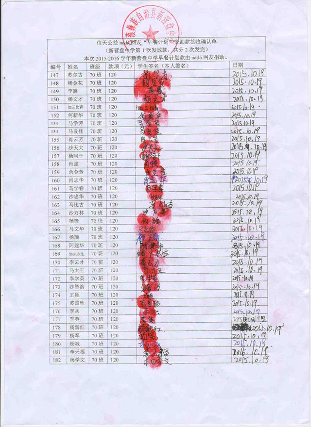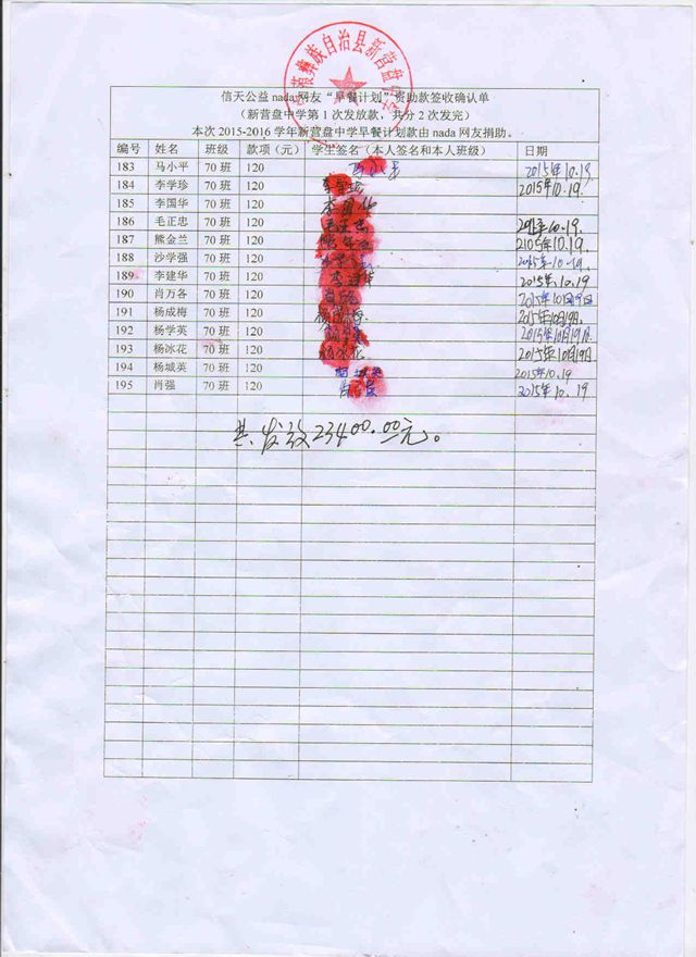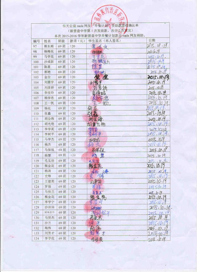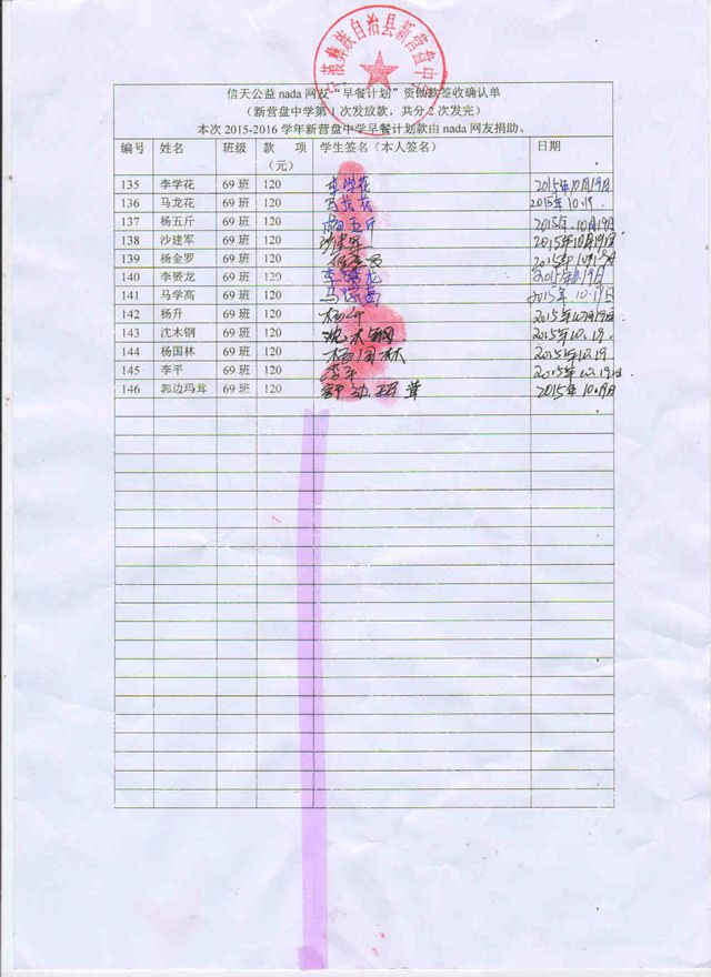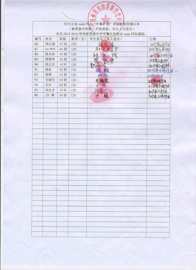 新营盘中学,2015-2016年早餐计划第一次发款签收单