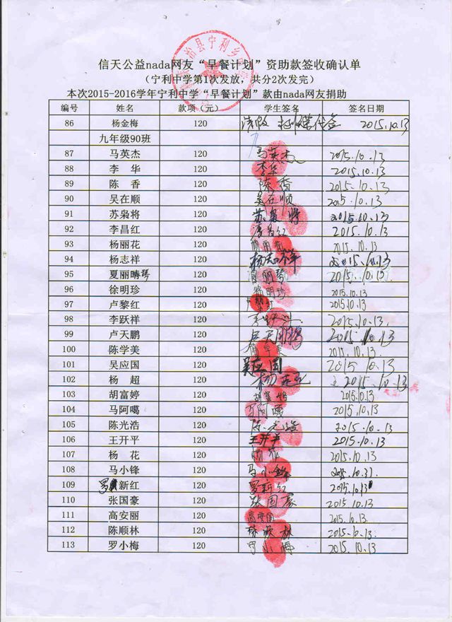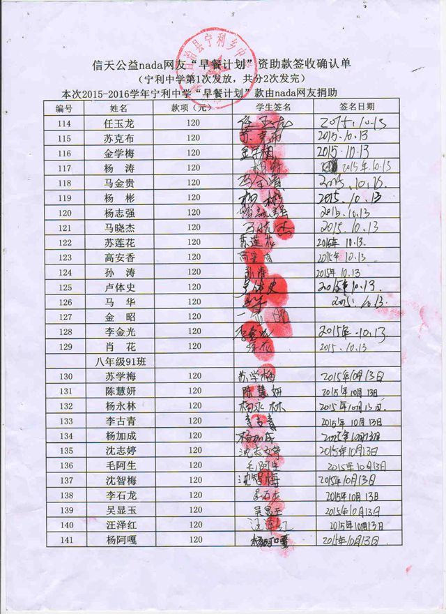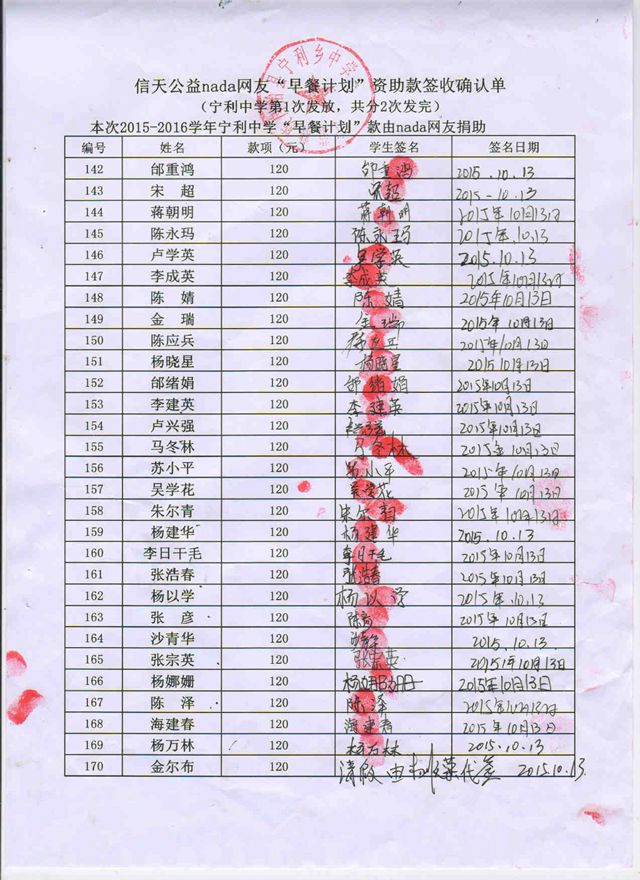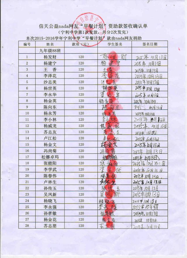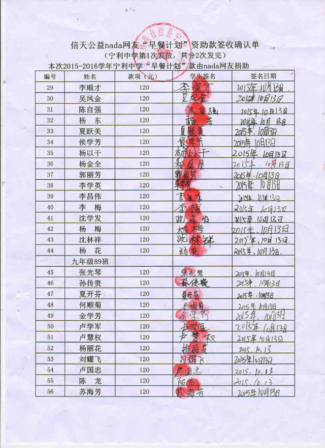 宁利中学,2015-2016年早餐计划第一次发款签收单