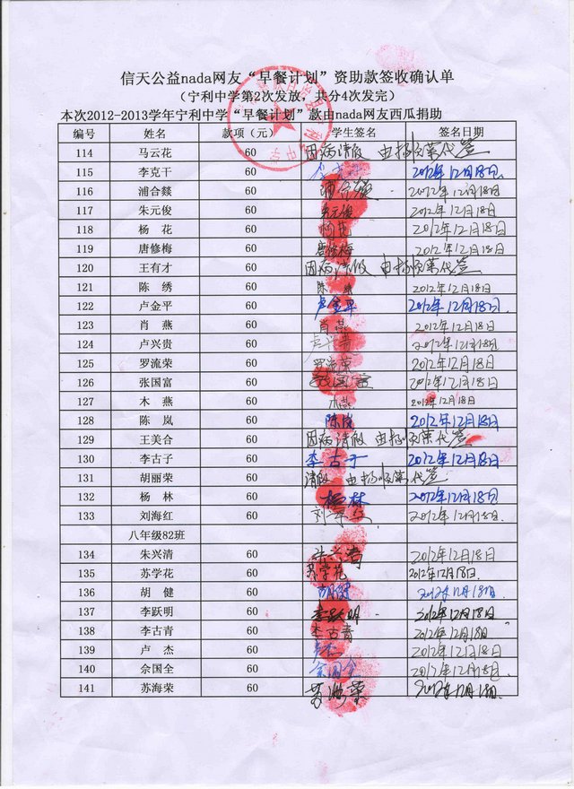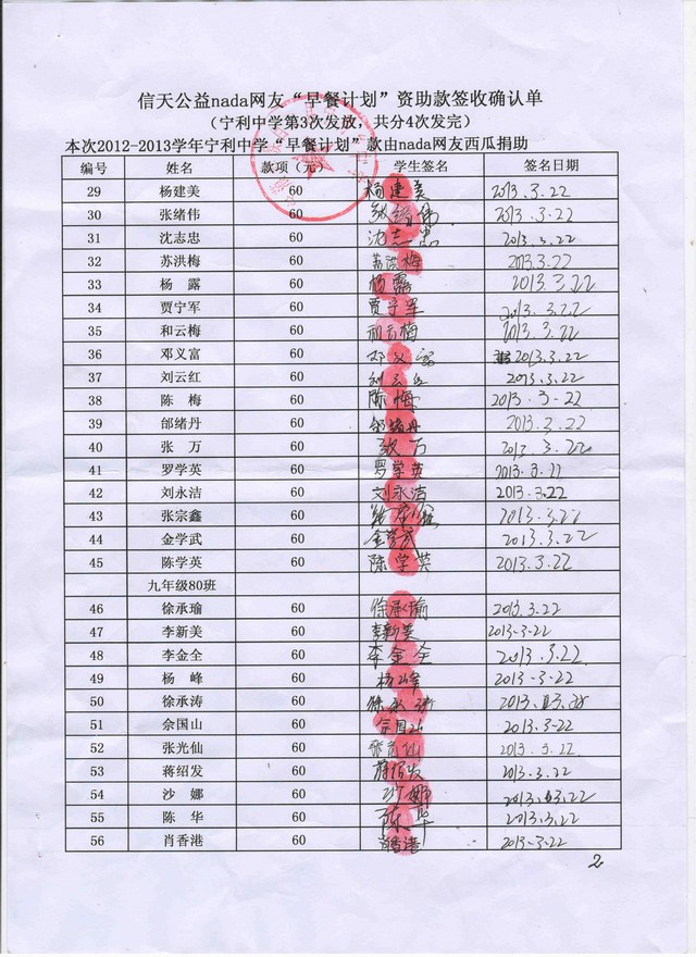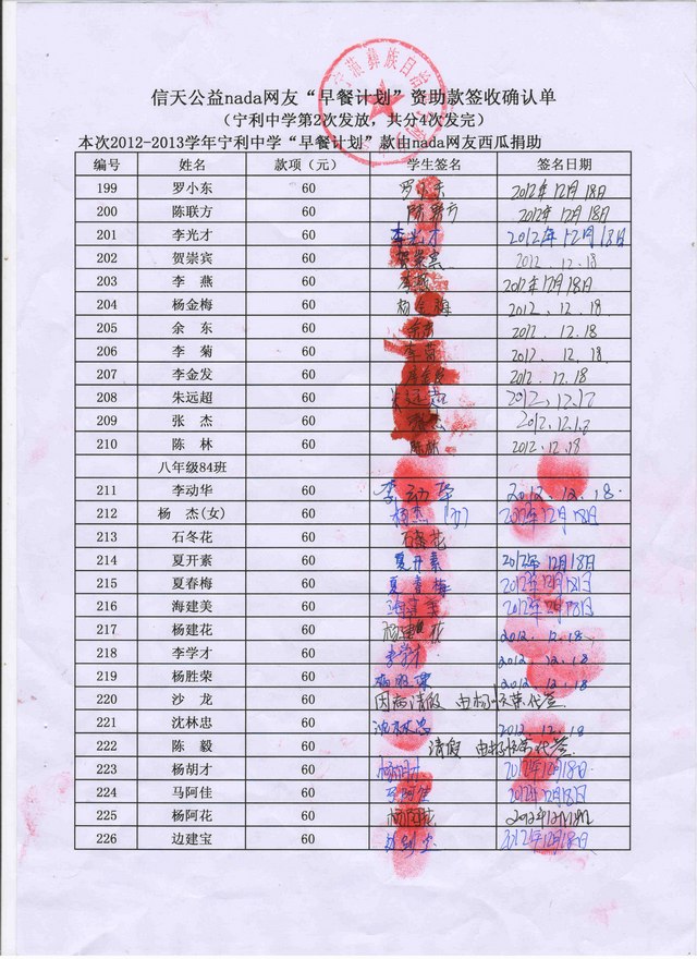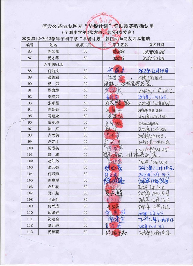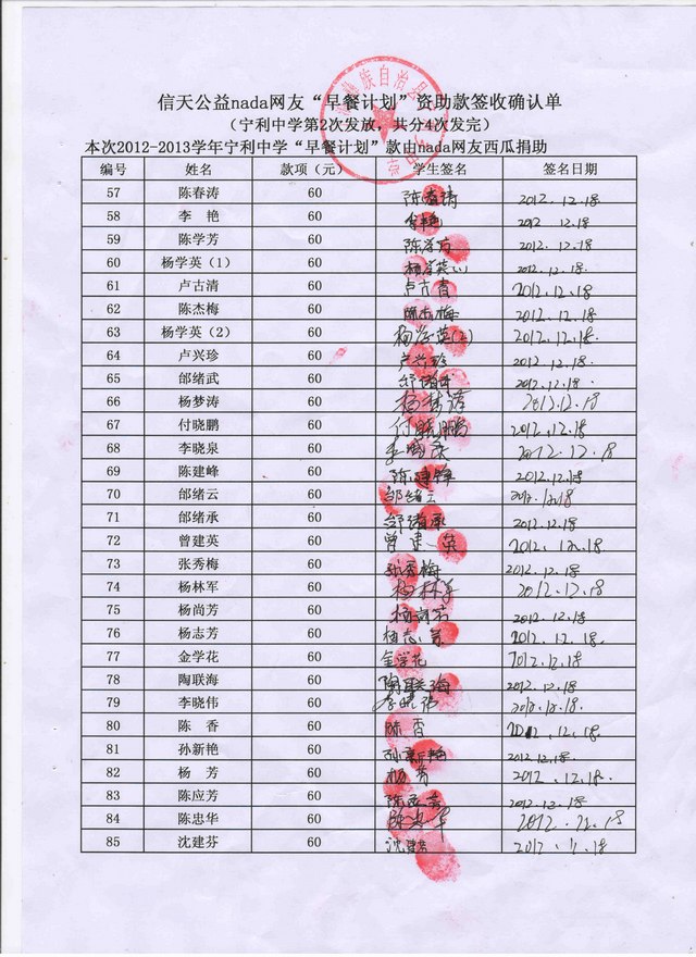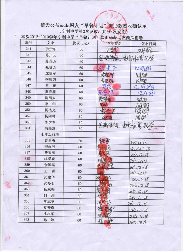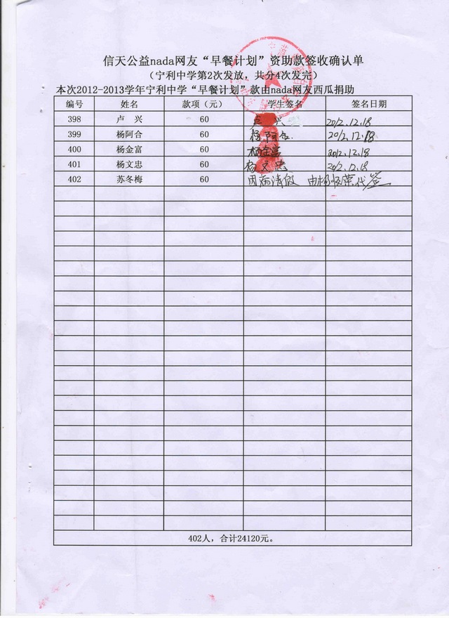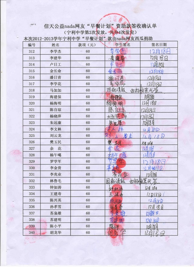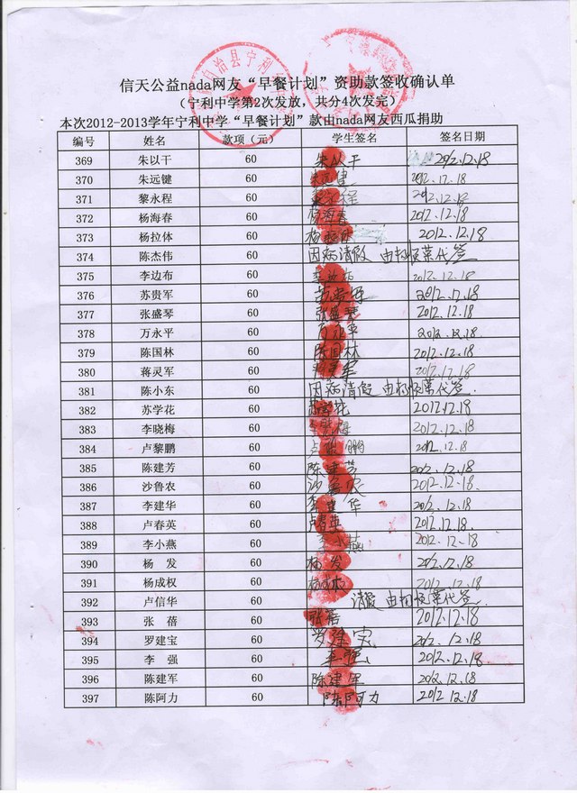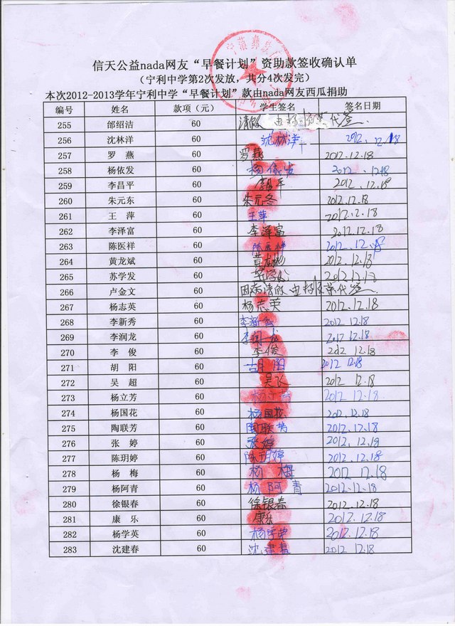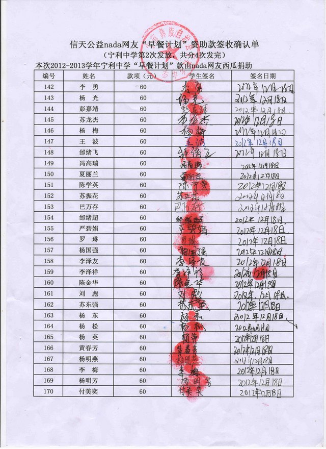 宁利中学2012-2013年早餐计划第二次发款签收单