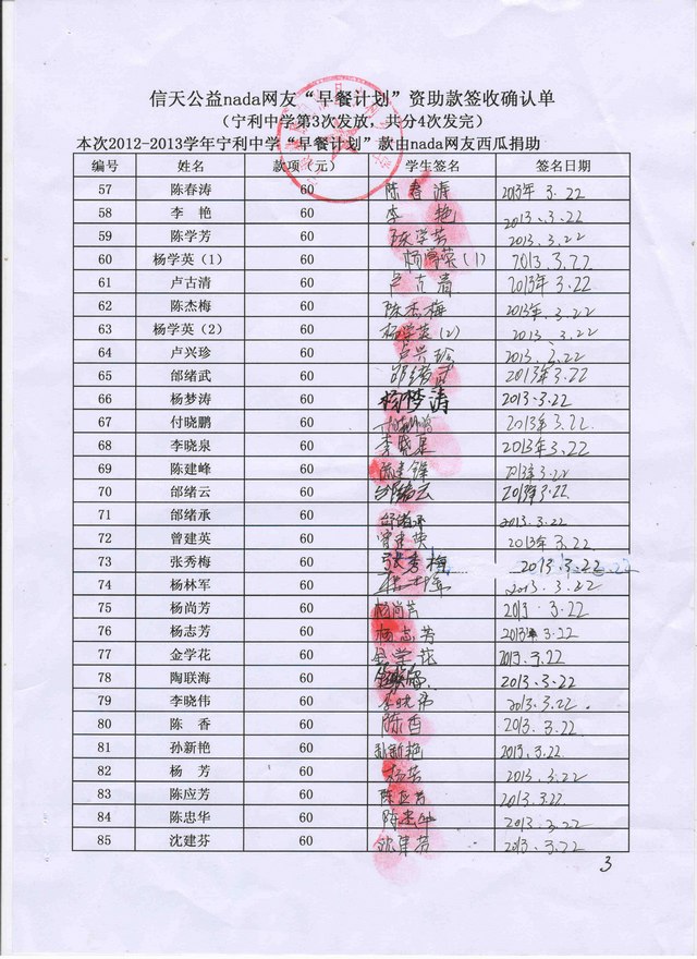 宁利中学2012-2013年早餐计划第三次发款签收单