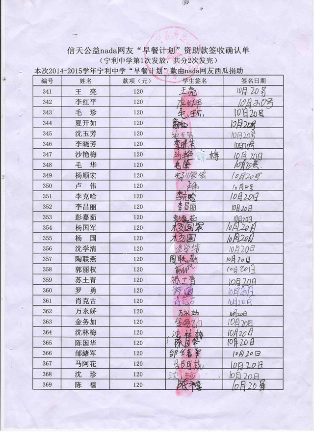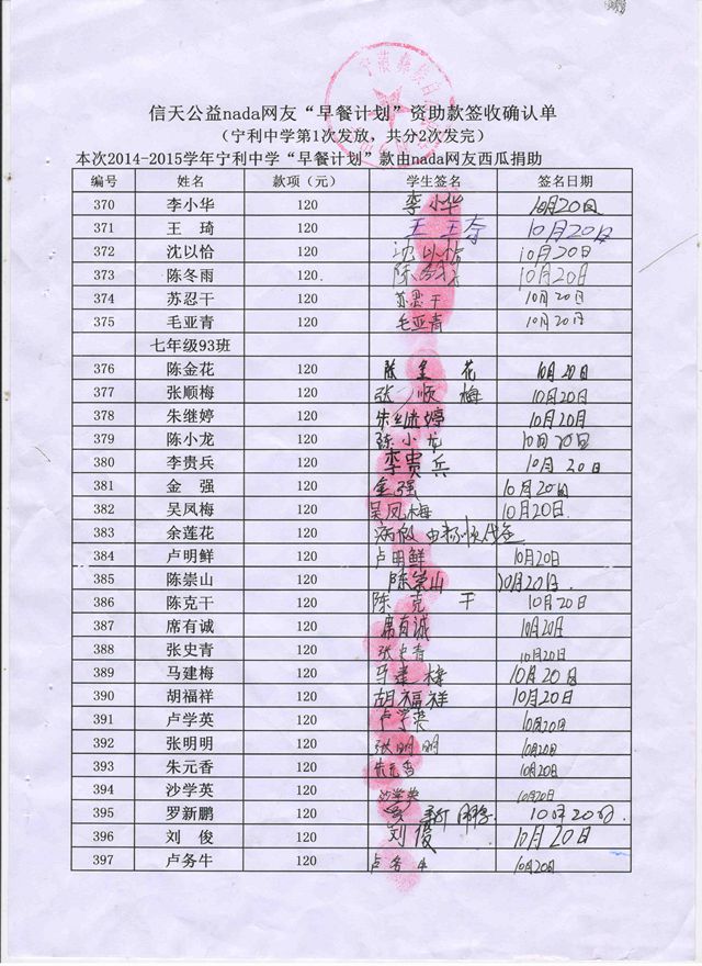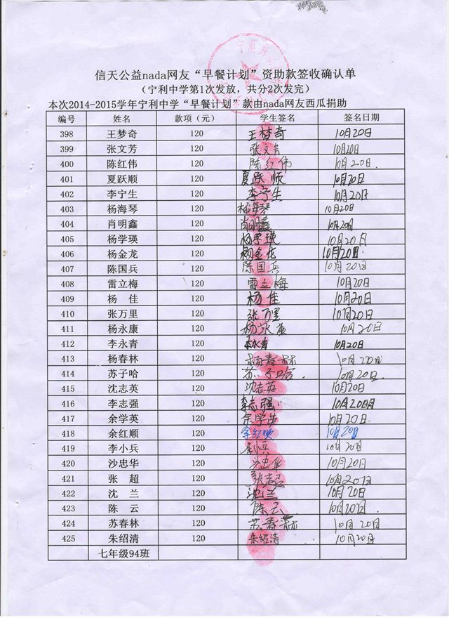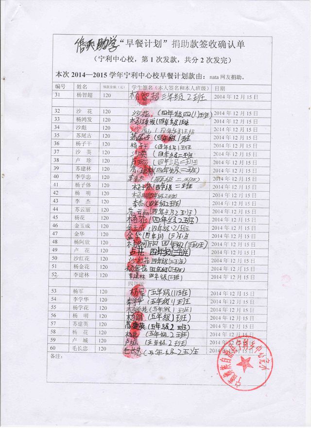 宁利中学,2014-2015年早餐计划第一次发款签收单