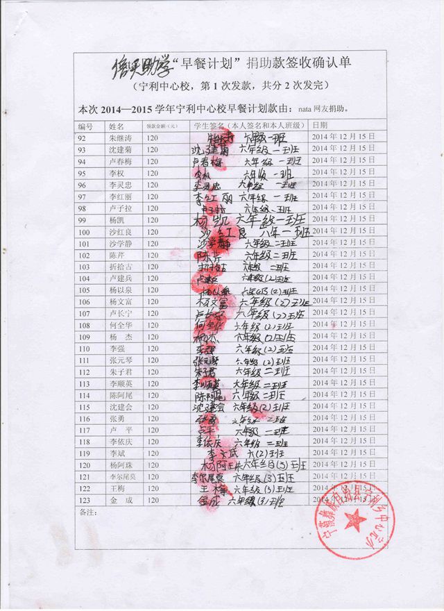 宁利中心校,2014-2015年早餐计划第一次发款签收单