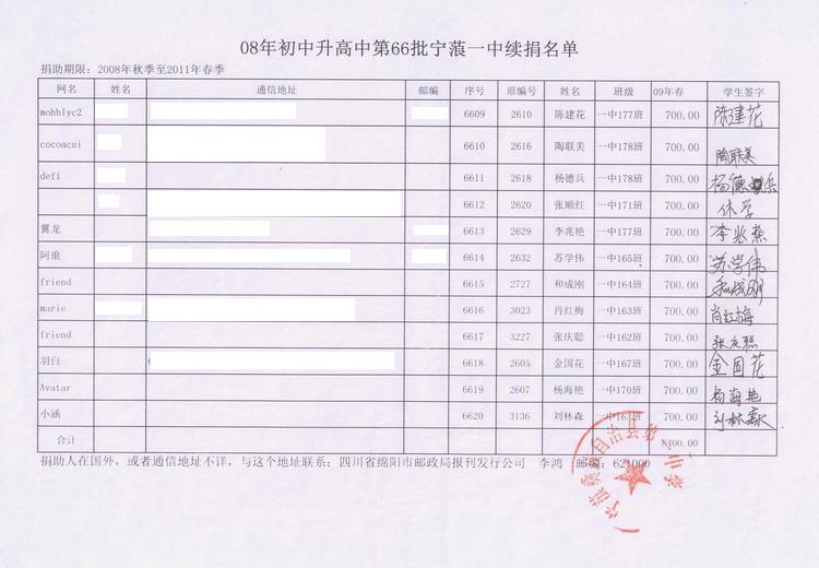 宁蒗一中66批(2010.9-2011.2)受助学生签字确认单