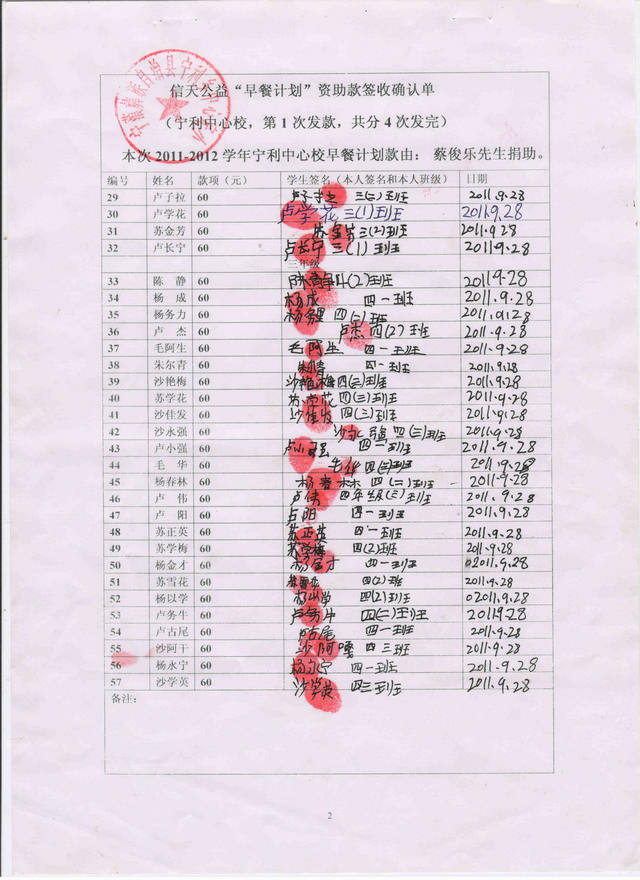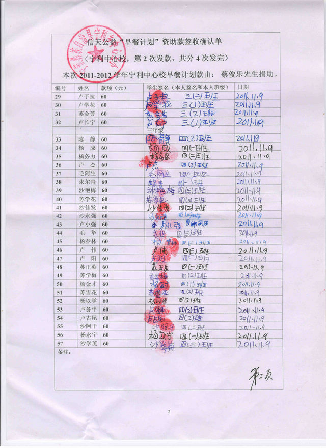 2011-2012宁利中心校“早餐计划”第2次发款签收确认单2: