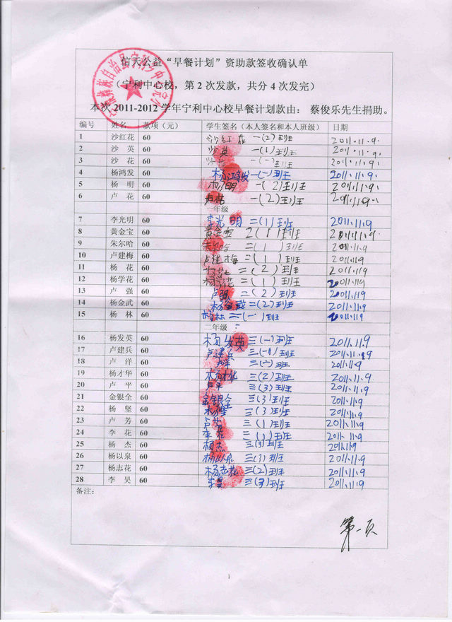 2011-2012宁利中心校“早餐计划”第2次发款签收确认单: