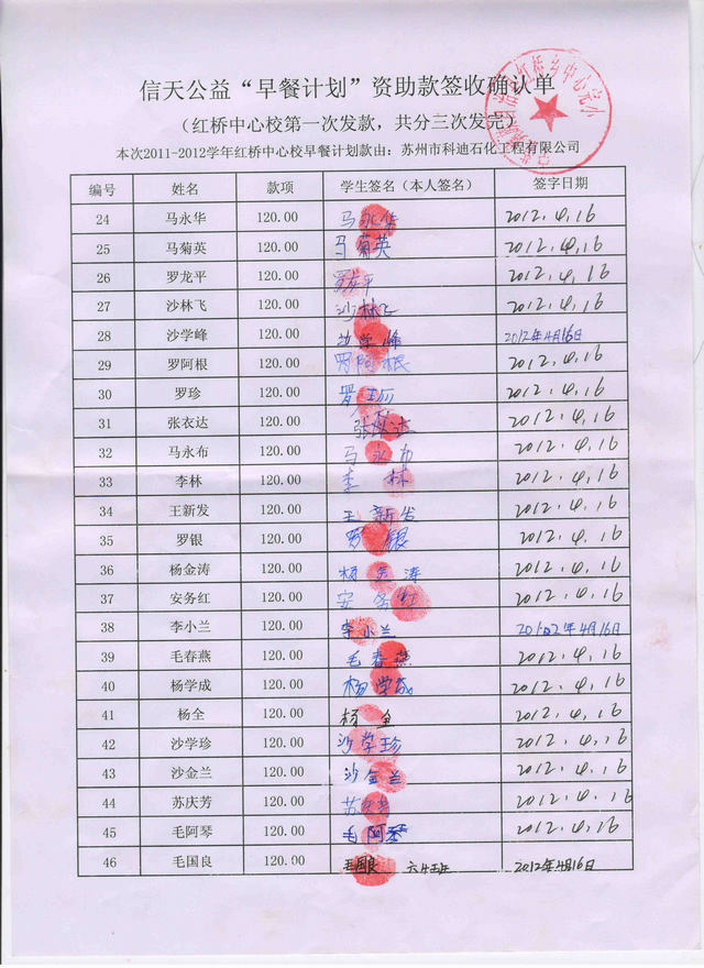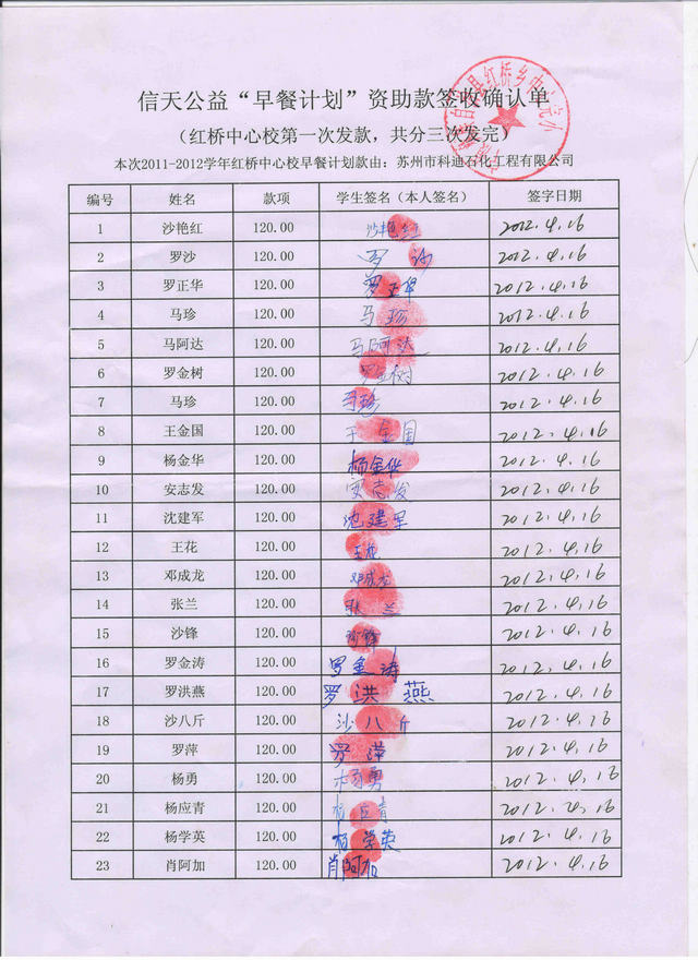 红桥中心校2011-2012年早餐计划第一次发款签收单