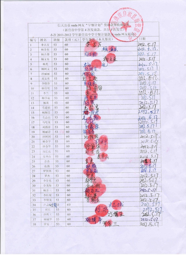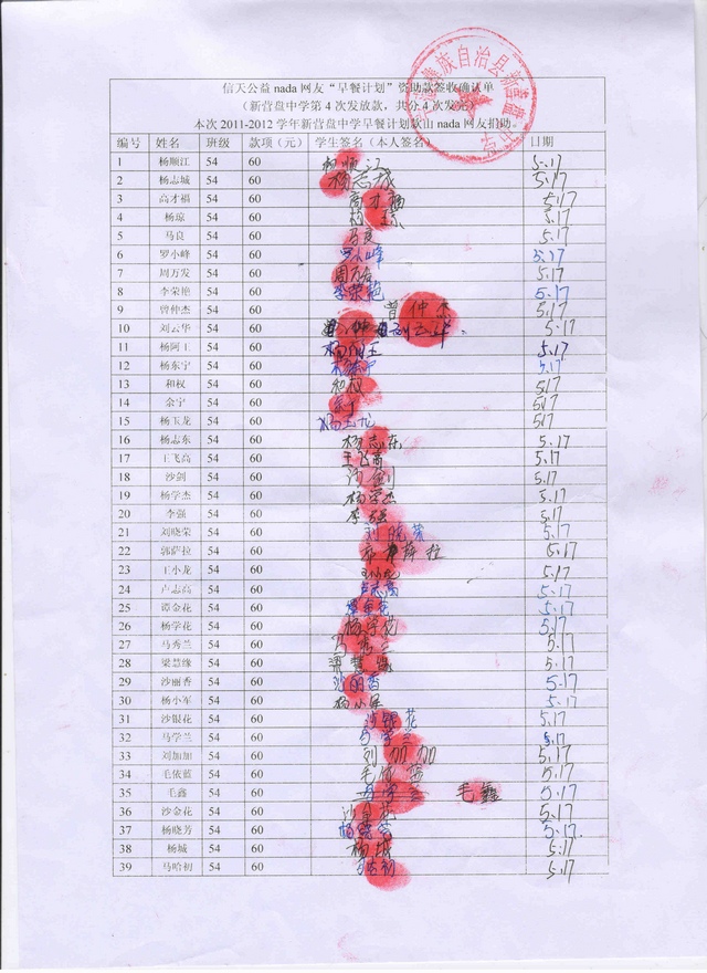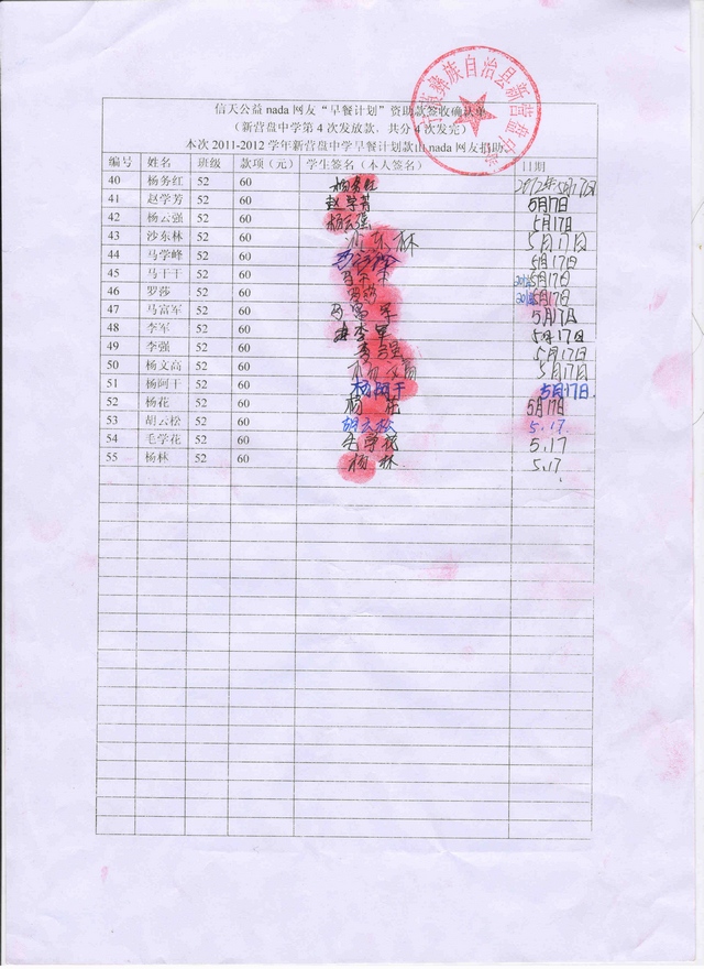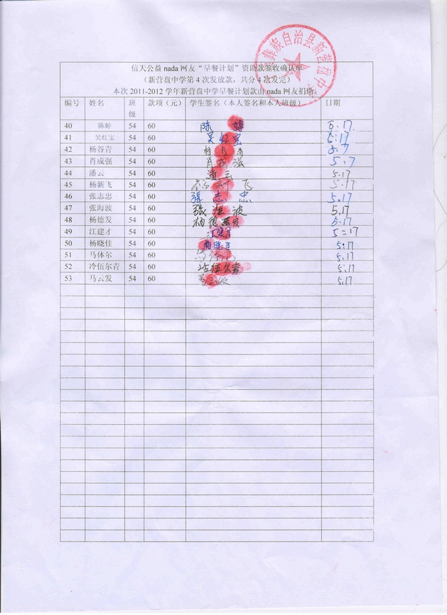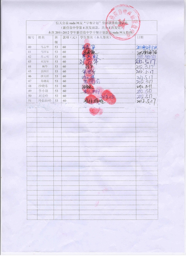 2011-2012新营盘中学“早餐计划”第4次发款签收确认单