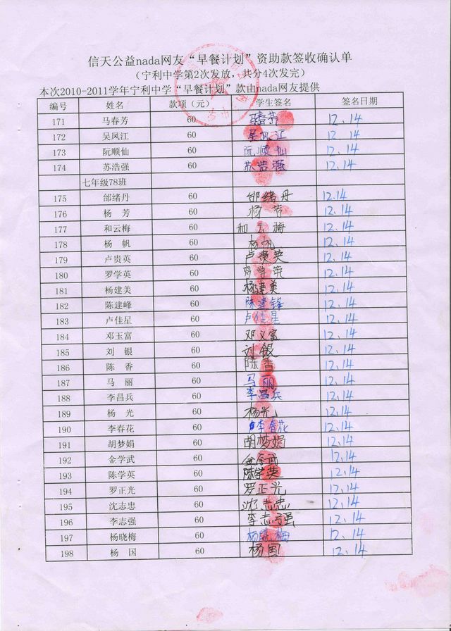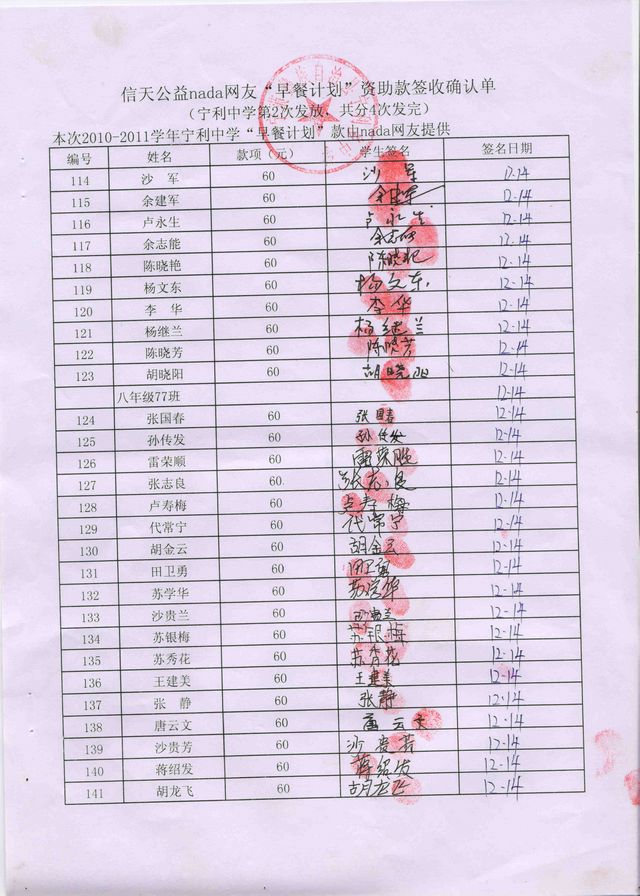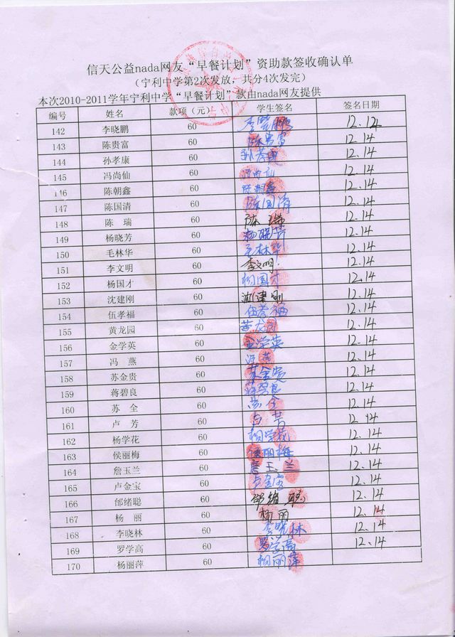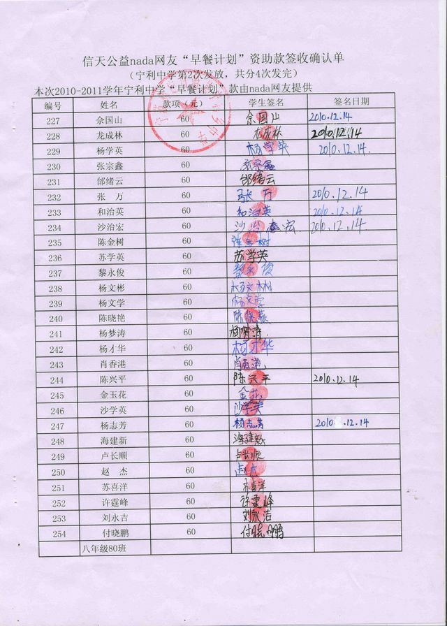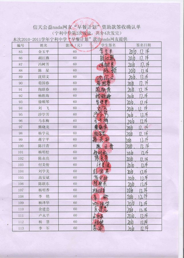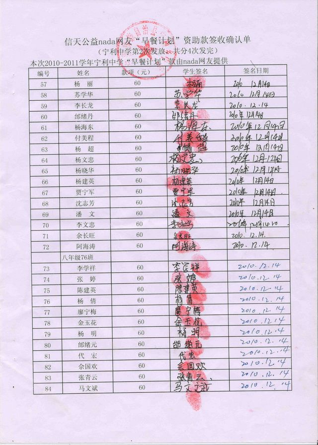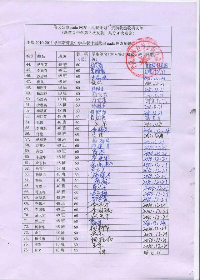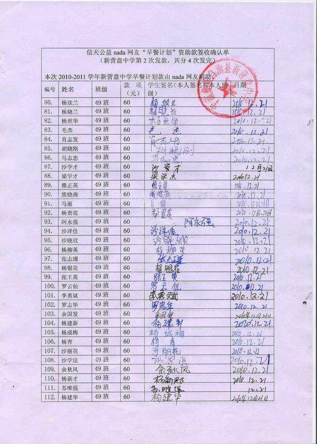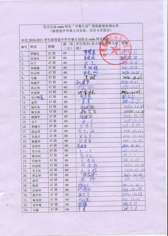 新营盘中学“早餐计划”资助款签收确认单——第二次发款