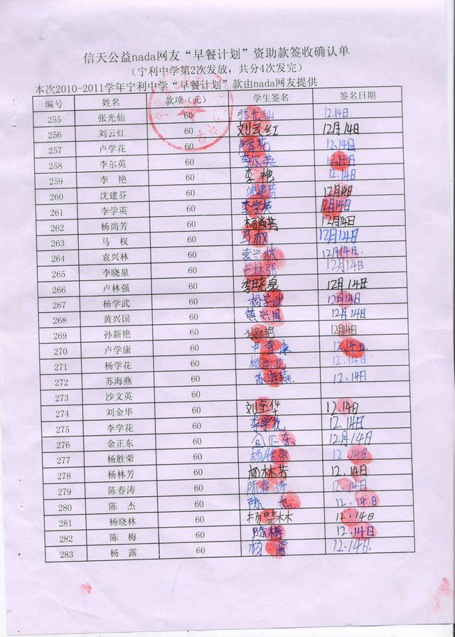 “早餐计划”资助款签收确认单——第二次发款