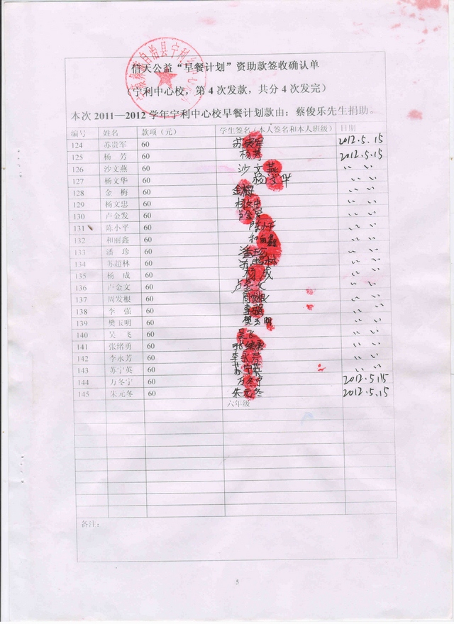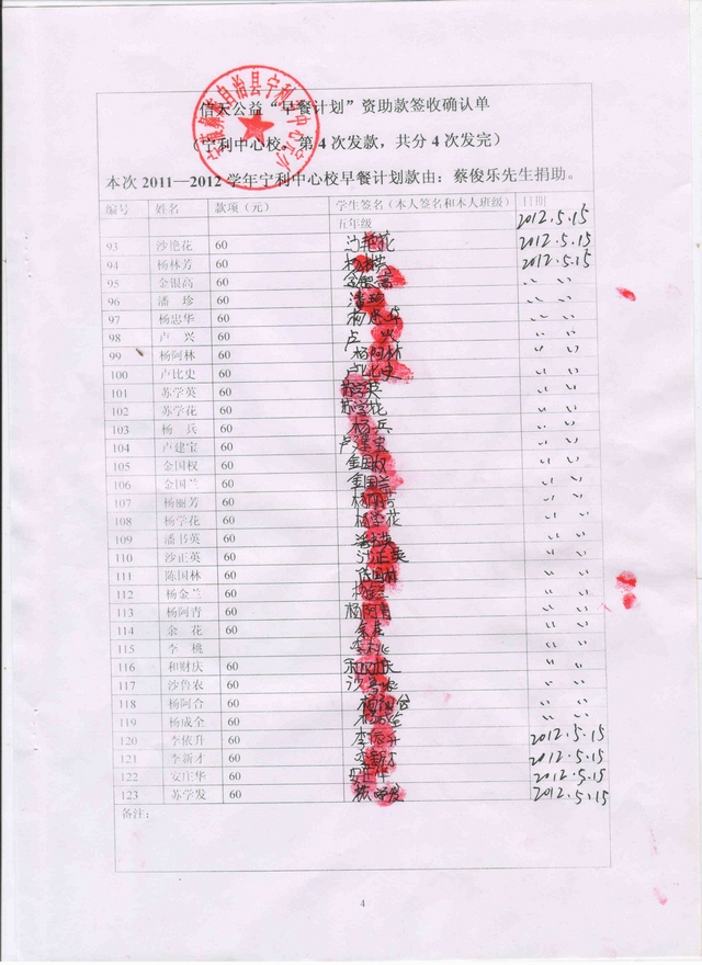 2011-2012宁利中心校“早餐计划”第4次发款签收确认单