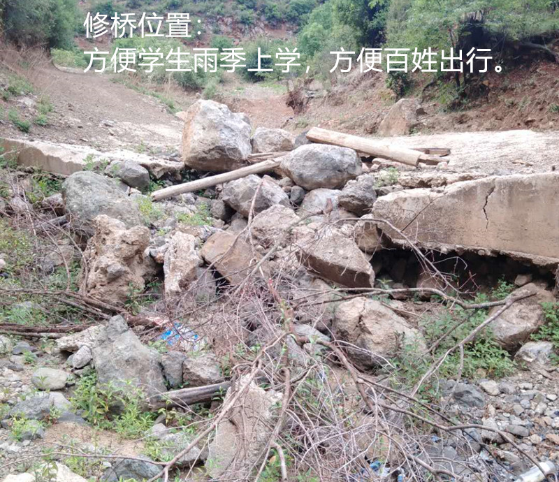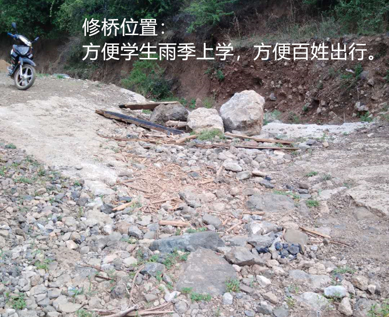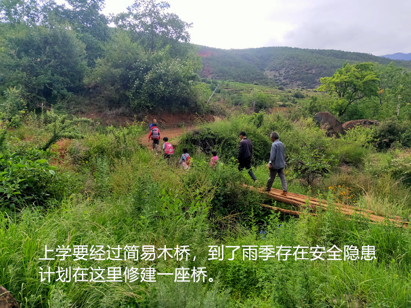翠玉乡翠玉村委会三岔河村主路附近的1条小路,这1条小路受益农户有50多户,该村以彝族为主。三岔河村,村子较大,具体分两个小村,即上村有52户、下村有56户、农户比较分散,还有很多翠玉乡其他村委会的村民搬迁至三岔河的有50多户。该村小学生就读到翠玉完小,中学生就读到翠玉中学。该村距离小学校2.5公里,距离中学2.5公里。该桥位于三岔河村至翠玉中、小学路段,涉及三岔河村50多户居民,140多人,其中有30多名孩子去学校读书,通过现在搭建的木桥,下雨后容易腐烂,不牢固,存在很大的安全隐患。