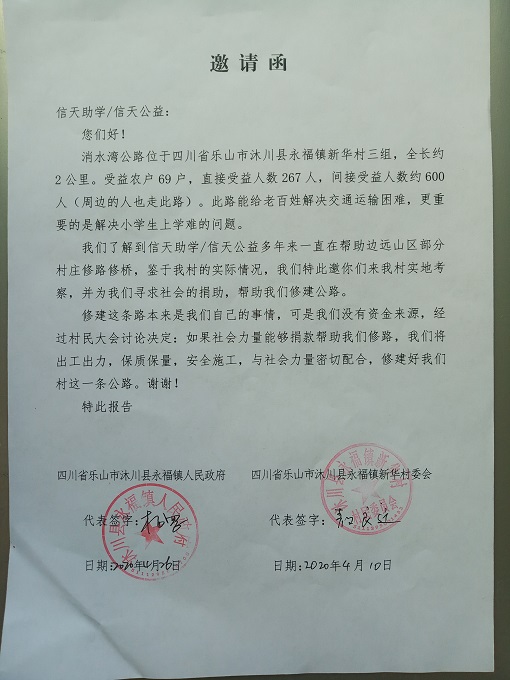 消水湾公路位于四川省乐山市沐川县 永福(镇)新华 村3 组。全长约 2 公里,起点:生箕埂 终点:消水湾 ,受益农户69户,直接受益人数 267 人,间接受益人数约600人(周边的人也从此路过)。修路能给老百姓解决交通运输困难、解决小学生上学难的问题。村民修路决心很大,全力集资,145 元/户,共集资 10000元,计划修通土路、支路、涵管、并铺设部份路面石,力争雨季也能通车。