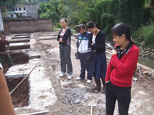 : [教师们观看施工现场]
