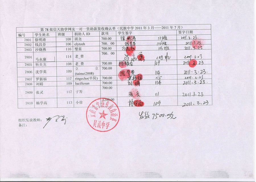 民族中学78批(2011.3-2011.7)受助学生签字确认单