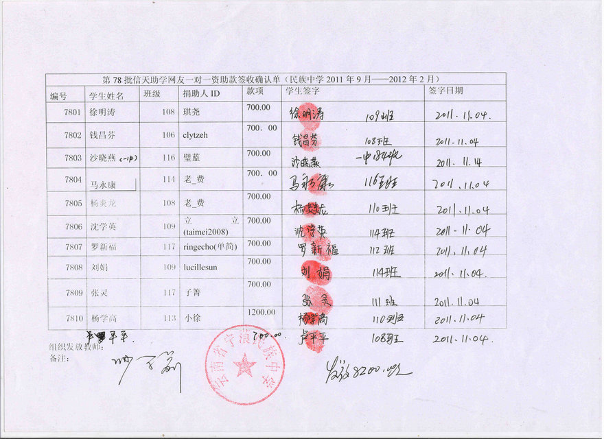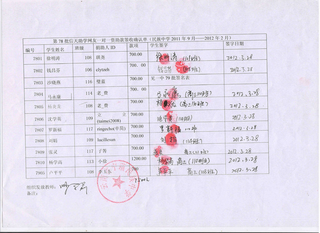 民族中学78批(2011.9-2012.2)受助学生签字确认单: