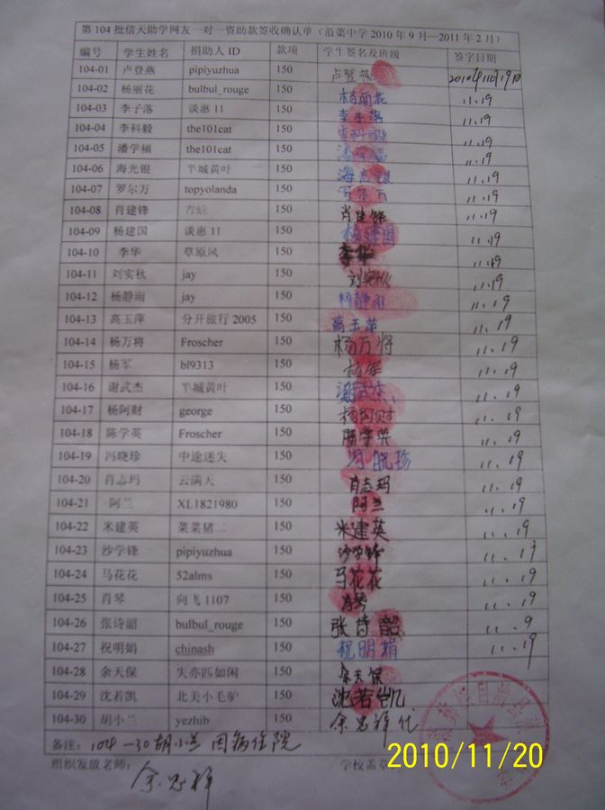 2010年10月12日 农行 2300.00 请汇出款项的资助人认领下