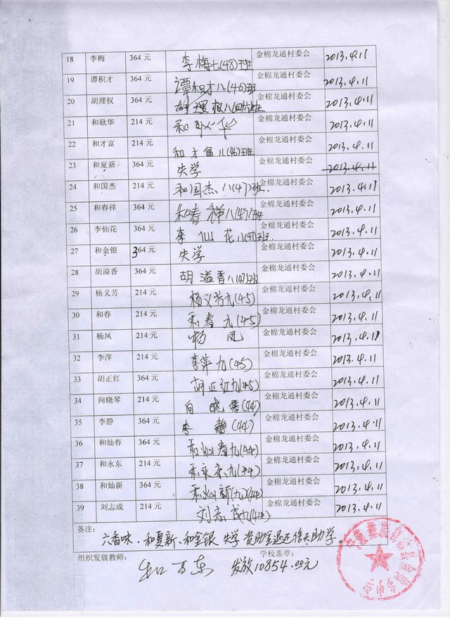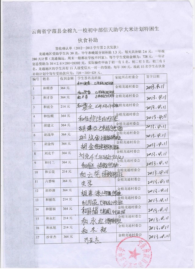 龙通地区受助学生共39名,中午和晚饭分别补助1.3元,每天共补贴2.6元,一年按280天计算(龙通偏远,周末一般都在学校不回家),每个学生一年受助金额为:728元,一年计划总资助为39×2.6×280=28392元,实际操作中由于初二有3名,初三有3名,龙通地区的学生共6人正在接受信天一对一的资助,每年300元,故此6名学生在伙食补助计划中每年受助款应为:728-300=428元,实际上去掉6名一对一已收到的300元资助款后,每年资助款为26592元。