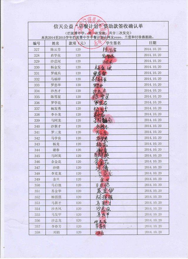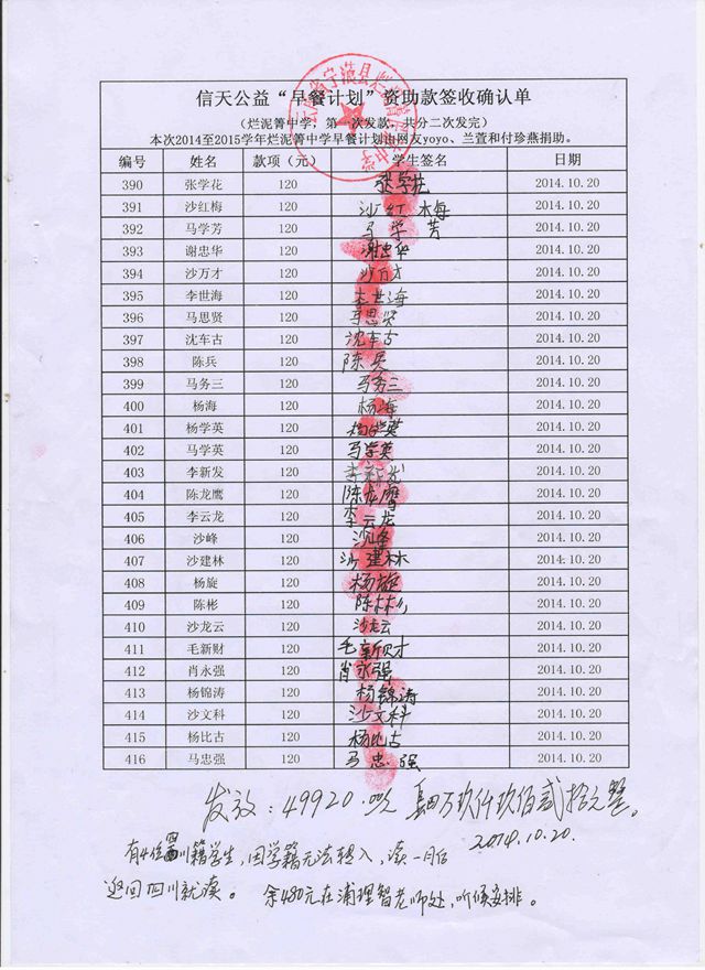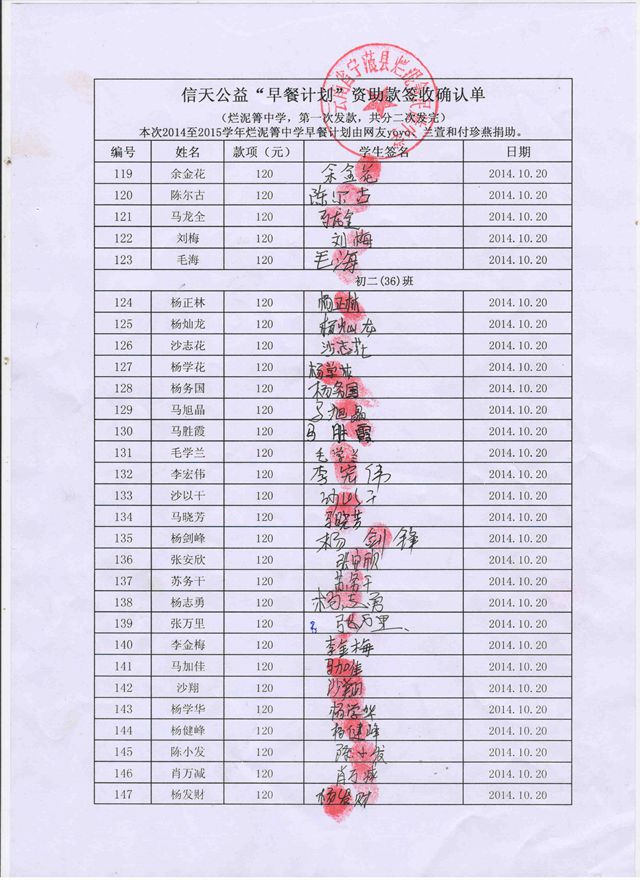 烂泥箐中学,2014-2015年早餐计划第一次发款签收单