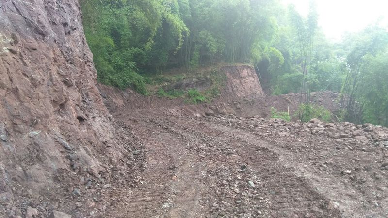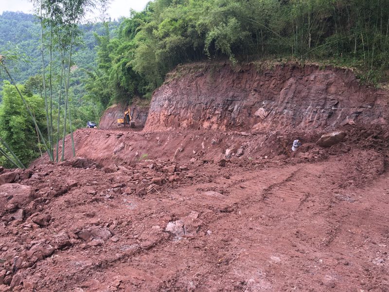 岩石计划炸药爆破,后改为挖机破碎。因为岩高钻炮眼危险,更主要是钻炮眼需要水,难度很大。