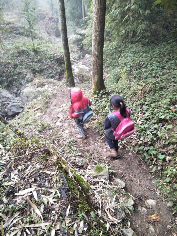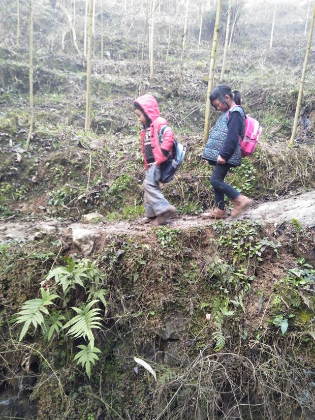 小学生上学之路,等修好了路之后,就可以坐拖拉机上学了,或者骑自行车上学了。