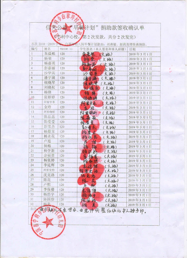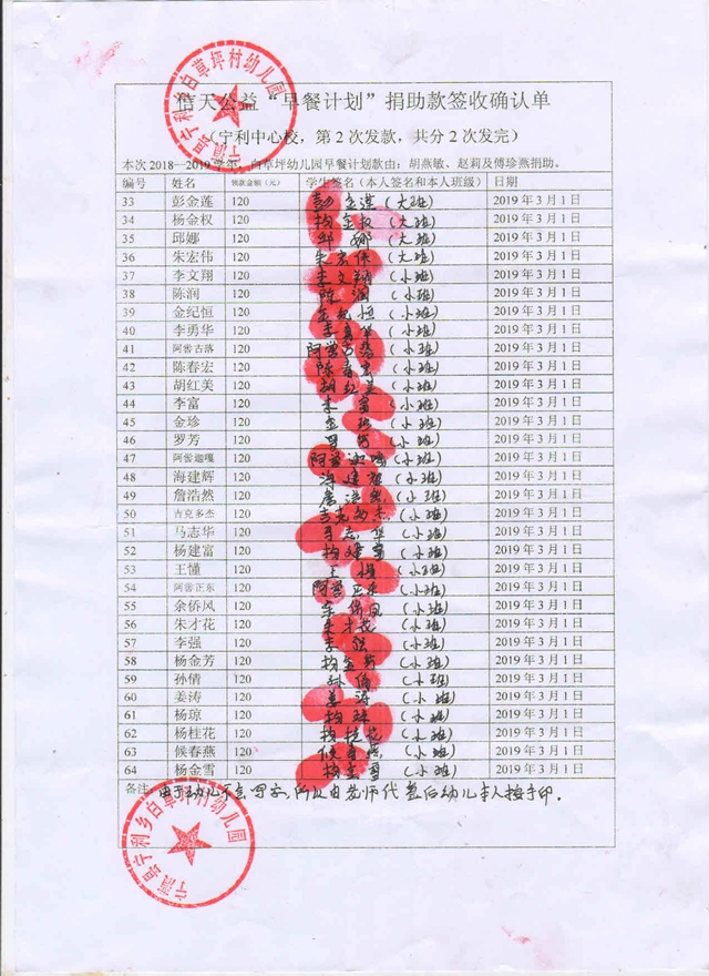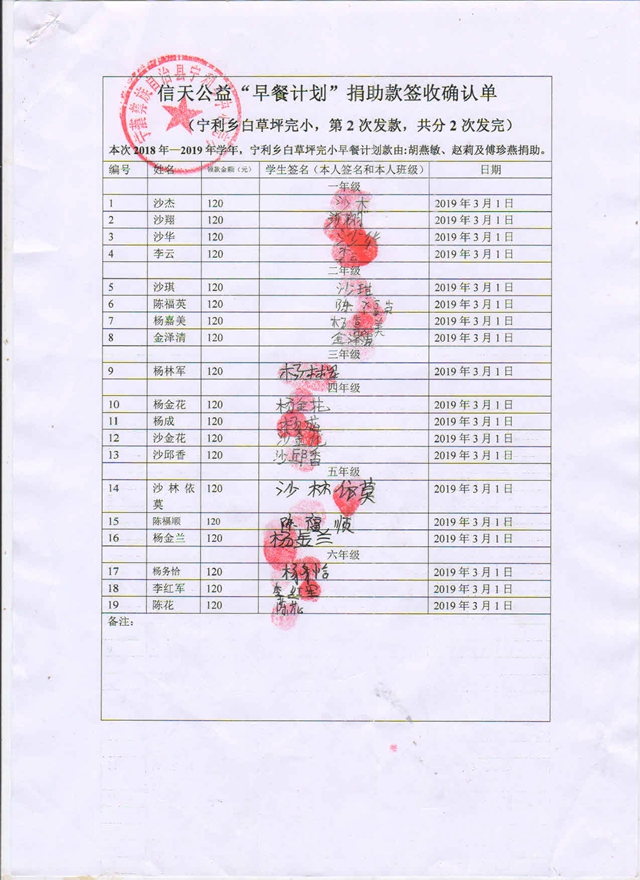 宁利白草坪完小,2018-2019年早餐计划第二次发款签收单