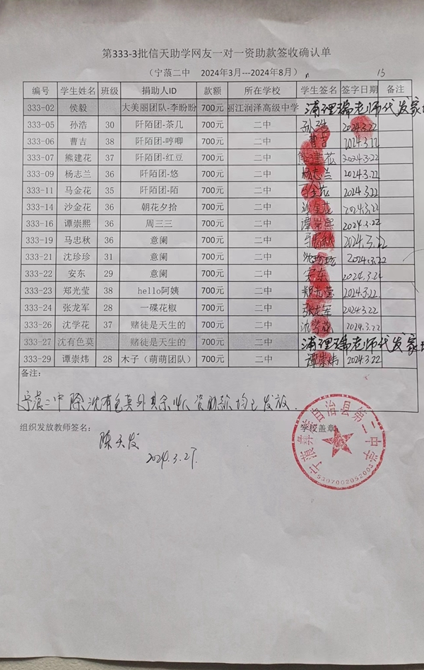 第333批续捐-宁蒗二中(2024年3月-2024年7月)受助学生签字确认单: