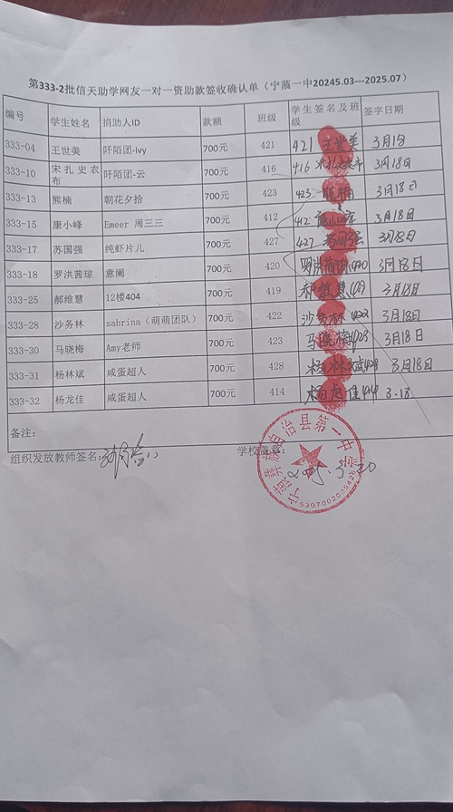 第333批续捐-宁蒗一中(2025年3月-2025年7月)受助学生签字确认单: