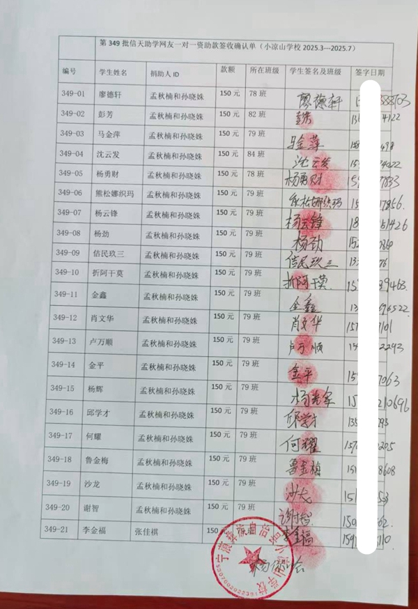 第349批小凉山学校(2025年3月到2025年7月)受助学生签收单