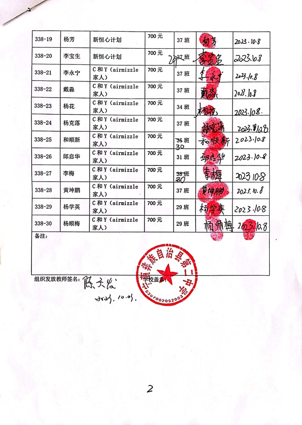 第338批宁蒗二中(2023年9月-2024年2月)受助学生签收单