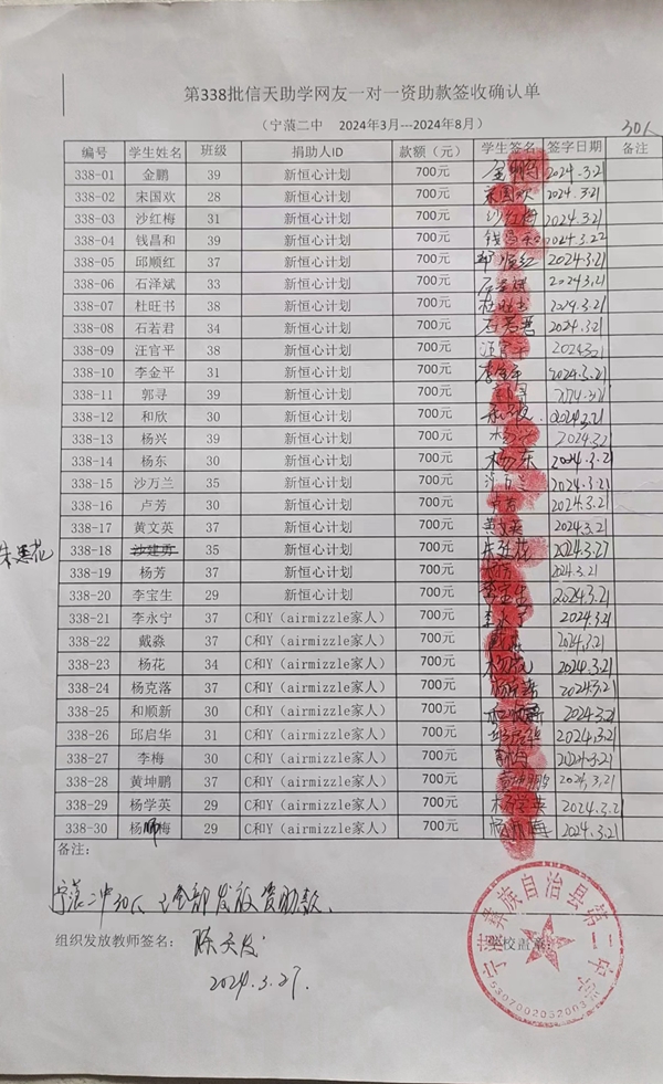 第338批宁蒗二中(2024年3月-2024年7月)受助学生签收单