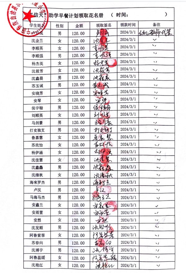 宁利中心完小,2023-2024年下学期早餐计划第二次发款签收单
