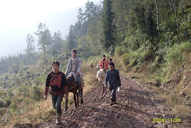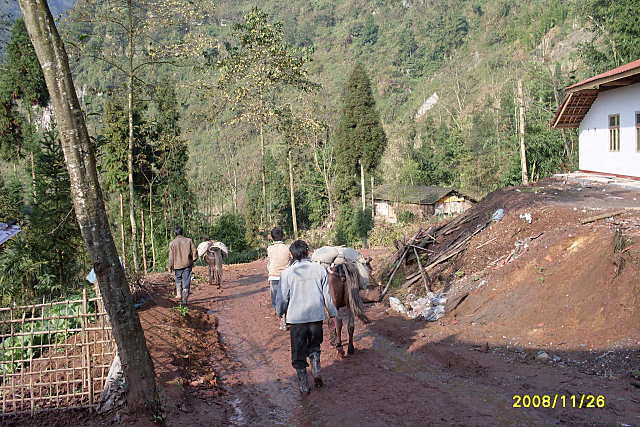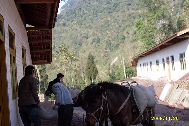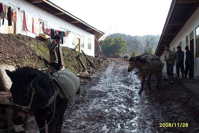 到雪峰村校的道路正在修,还有两个小时的路程需要靠马匹驮运(组织了9匹马在驮运),气温下降,天天夜里下雨,道路泥泞不堪,建材运输相当困难。一天只能驮运两次,工地只好停工待料……