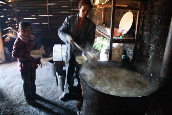学校的伙房,很难能吃到肉,大锅里只是煮白菜,没有一点肉。