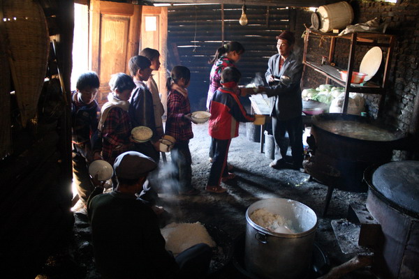 而在龙通完小,还有一些学生饿着肚子上课,贫穷吃不饱。我们的义教老师佤蓝和朋友们就想起了‘大米计划’, 她在当地支教时发现,学生们经常吃不饱,尤其是寄宿生,经常因为饿肚子逃学回家,在父母身边好歹总能找到口饭吃。当讲台下坐着的是一群饿着肚子的孩子时,对老师和学生来说,这课都很难上。后来2007年4月,佤蓝和捐助人一起,给龙通村完小寄宿生第一个学期的5000斤大米,经过5个半小时的行程,送到了学校。第一期大米计划结束的时候,龙通村完小的杨校长打来电话,“学生的就读率从没有像现在这么高”!原因很简单,老师按照寄宿学生名单分配大米,来上课的人才有,就算为了这口饭,家长和孩子都愿意上学了。