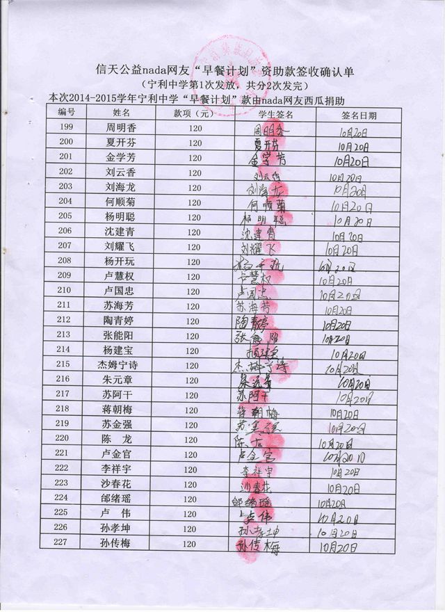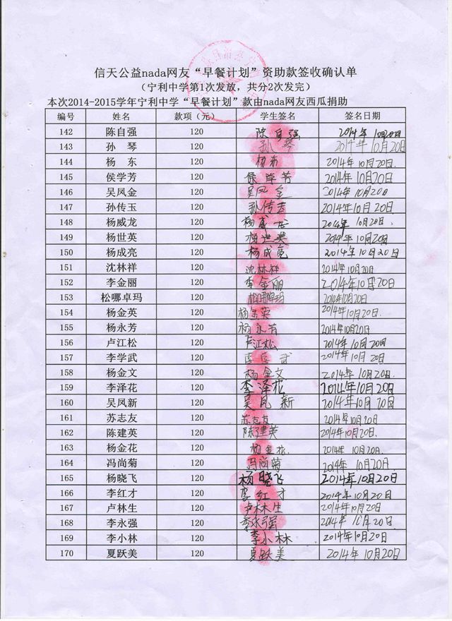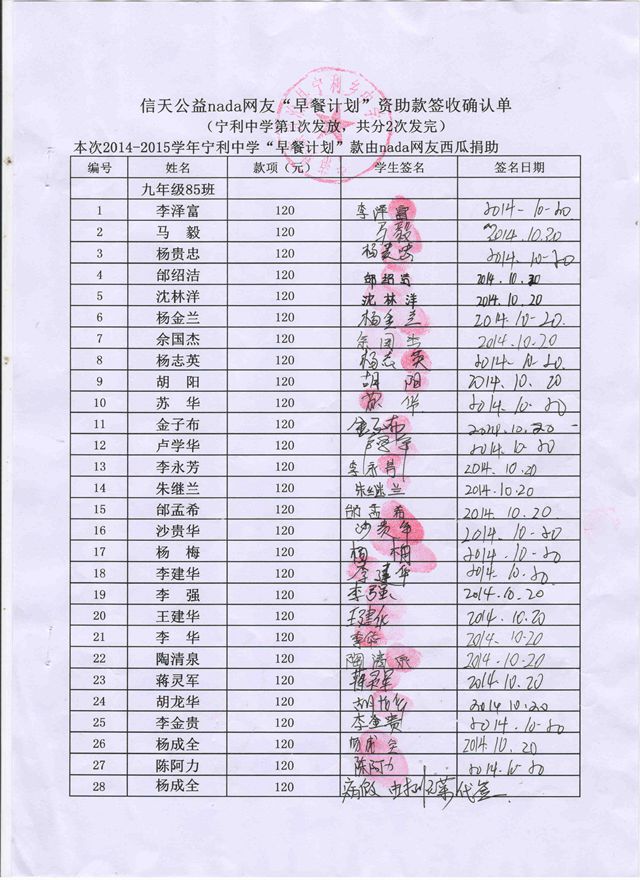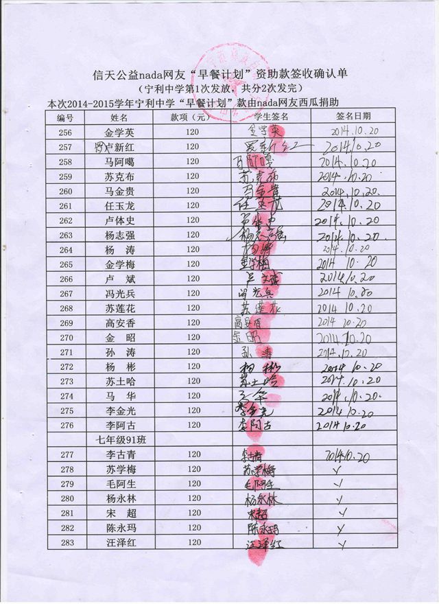 宁利中学,2014-2015年早餐计划第一次发款签收单
