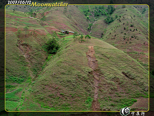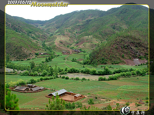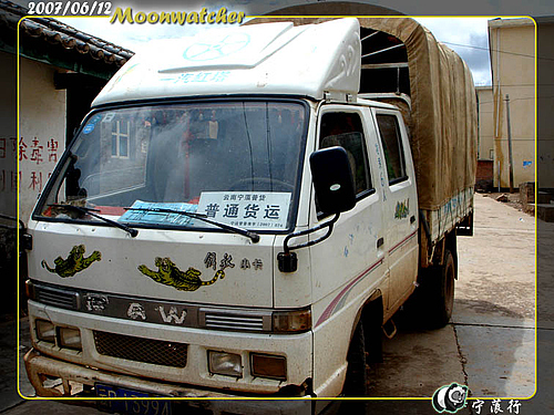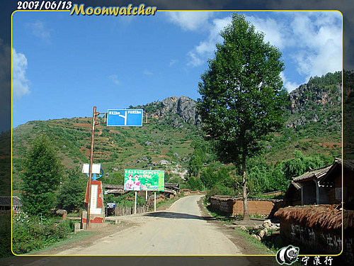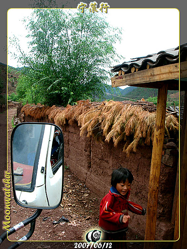 昨天说好一百元包他的车,他才愿意专门从烂泥箐开出来。卸货,装货,沿途不断有人在车窗外冒头托司机捎钱、捎物,耽搁了好一会儿功夫,车子终于目标明确地驶上去丽江方向的一条大路。这种路况,怎能叫烂!为什么当地人众口一词说去烂泥箐的路烂?正疑惑着,车身一腾,拐上了一座颤颤危危的小木桥,朝一排木楞房径直冲去!这当然是我的错觉,事实上,车子灵活(同时也很惊险)地在两排木楞房之间狭长曲折的甬道穿来穿去,一直开进山里。