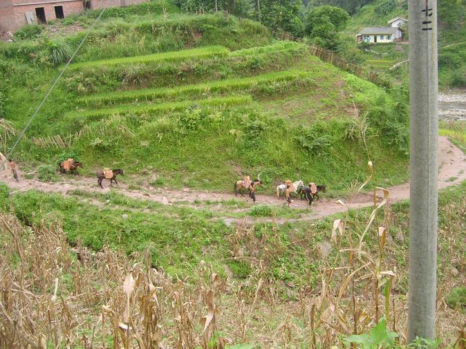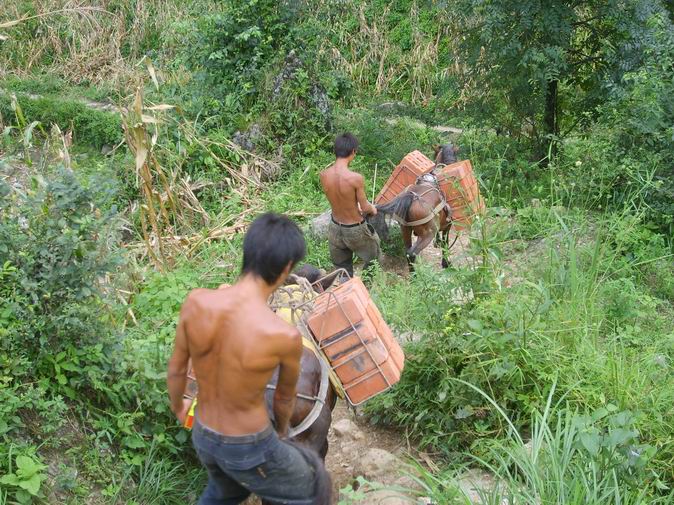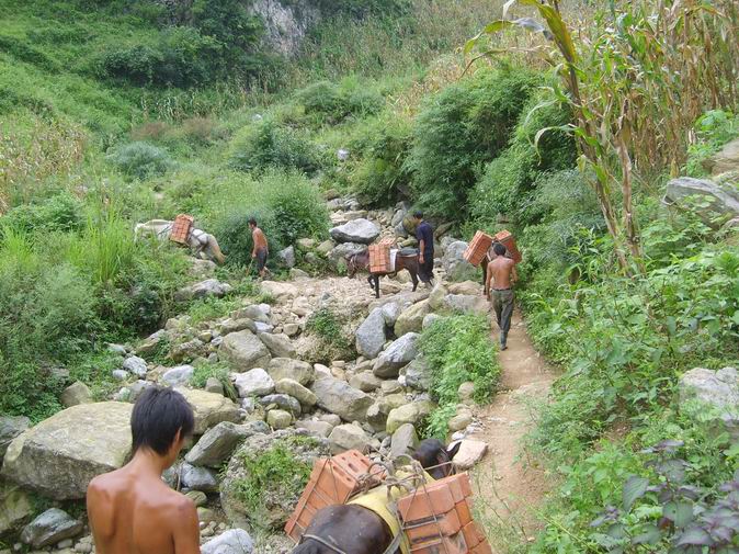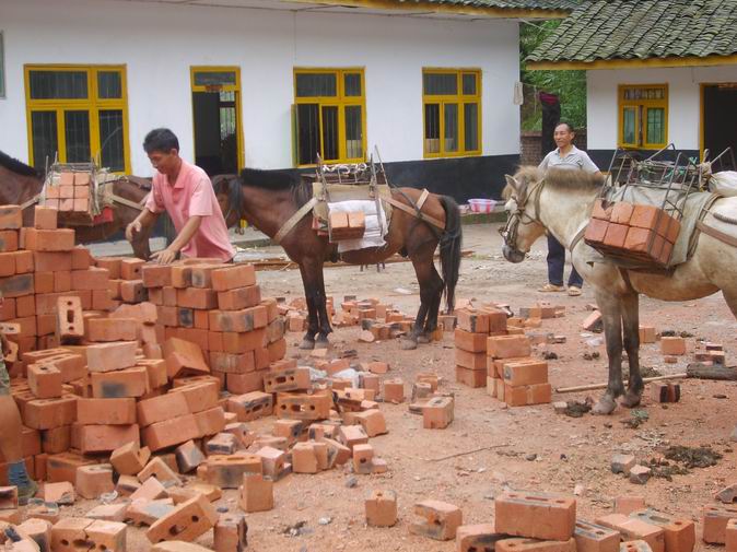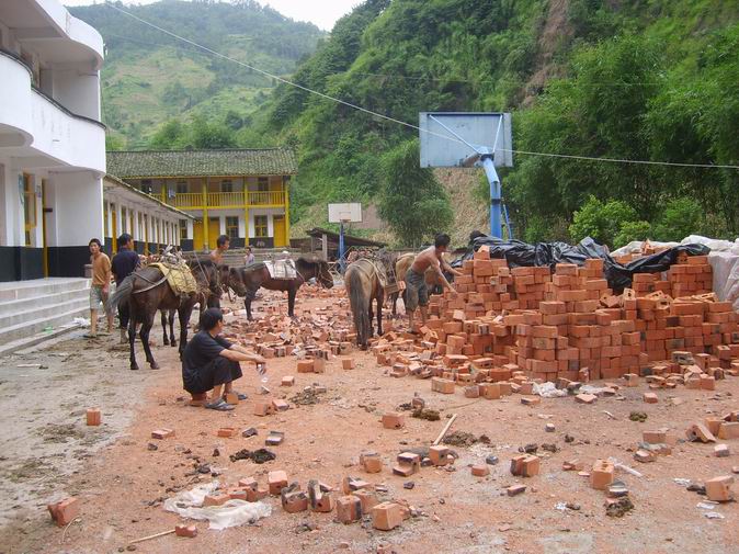 第一次运输,是砖头用车拉到袁家溪中心小学,从这里中转,再二次运输..
