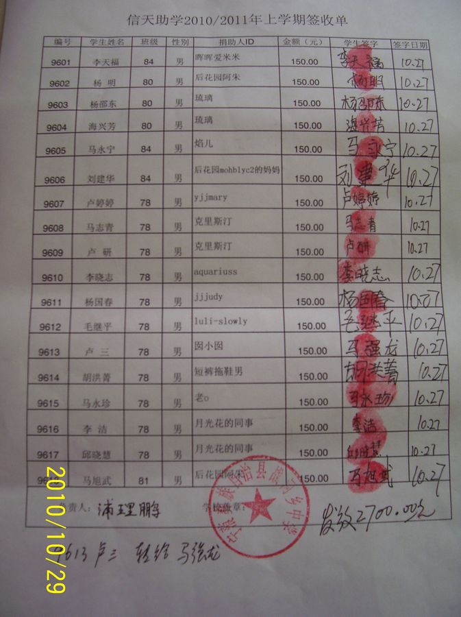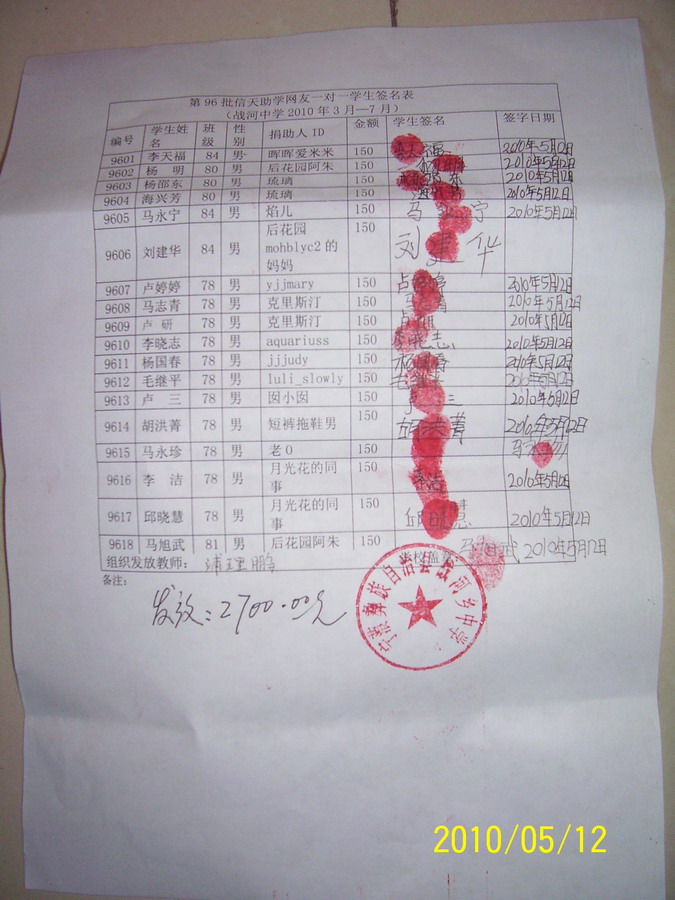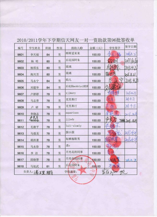 战河中学96批(2011年3月-2011年7月)信天助学款发放签名表