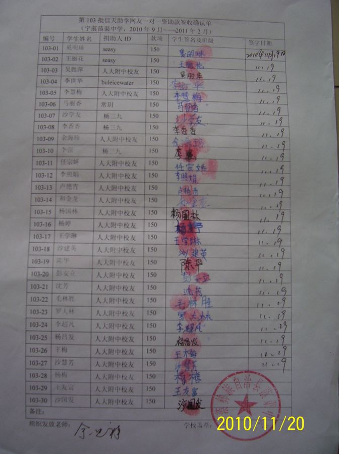 蒗渠中学第103批(2010.9-2011.2)受助学生签字确认单