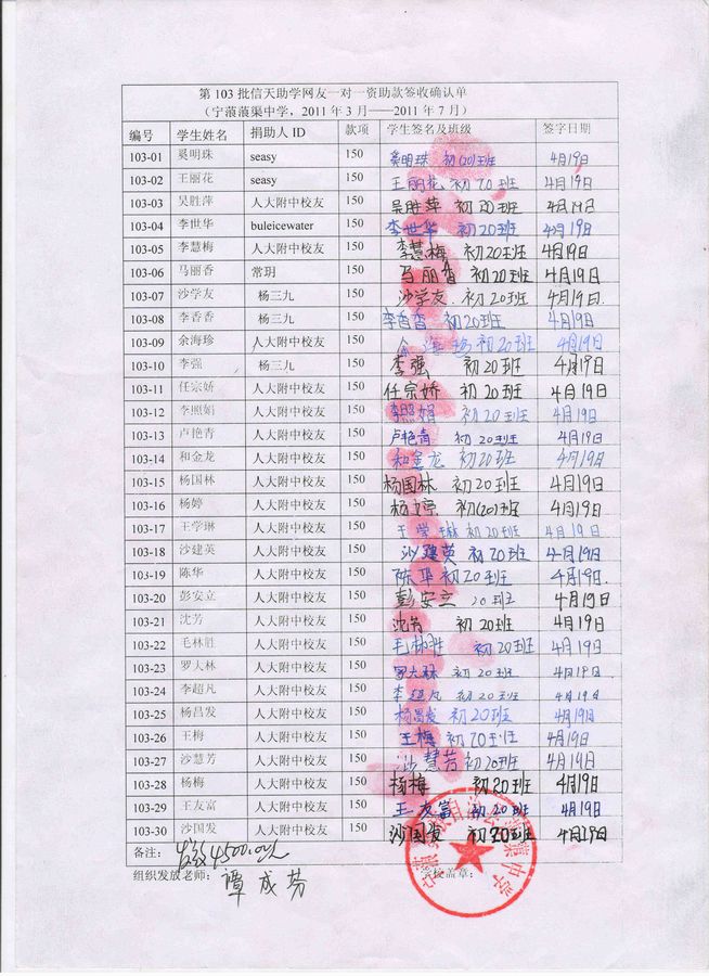 蒗渠中学第103批(2011.3-2011.7)受助学生签字确认单