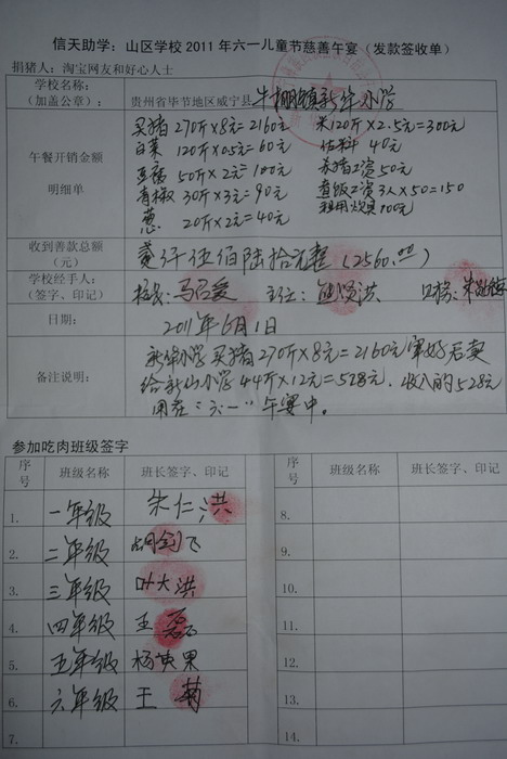 2011年"六一"慈善宴会学校签收单(贵州省)