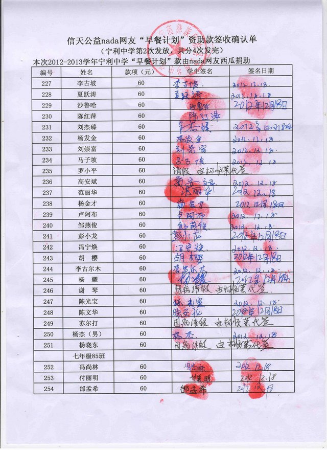 宁利中学2012-2013年早餐计划第二次发款签收单