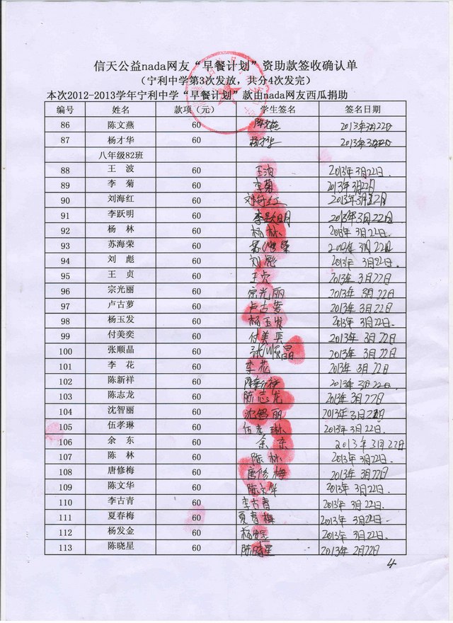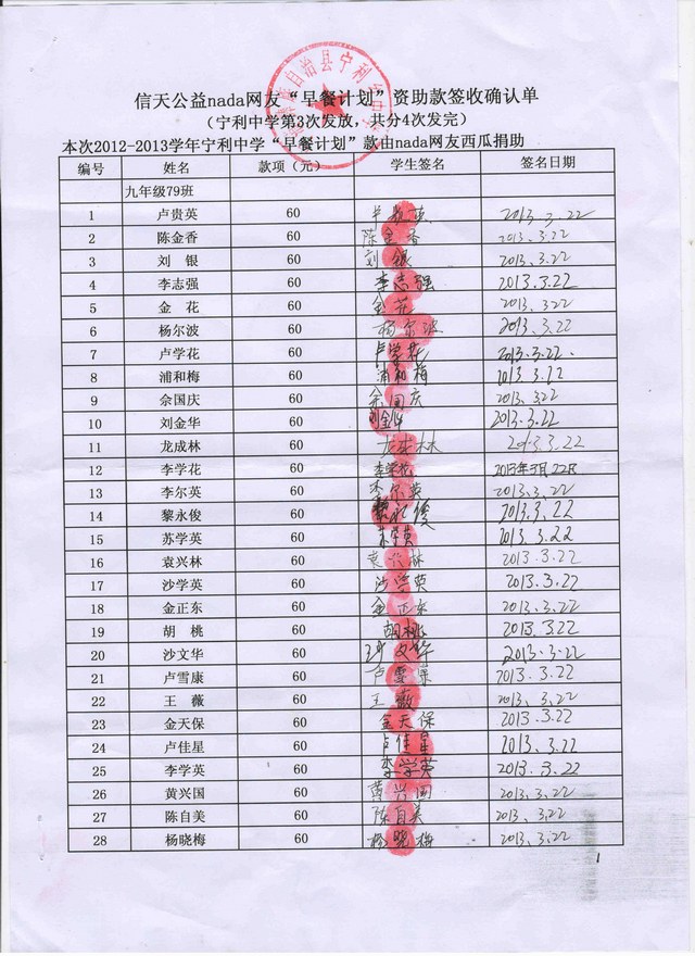 宁利中学2012-2013年早餐计划第三次发款签收单