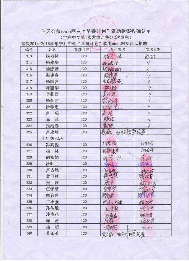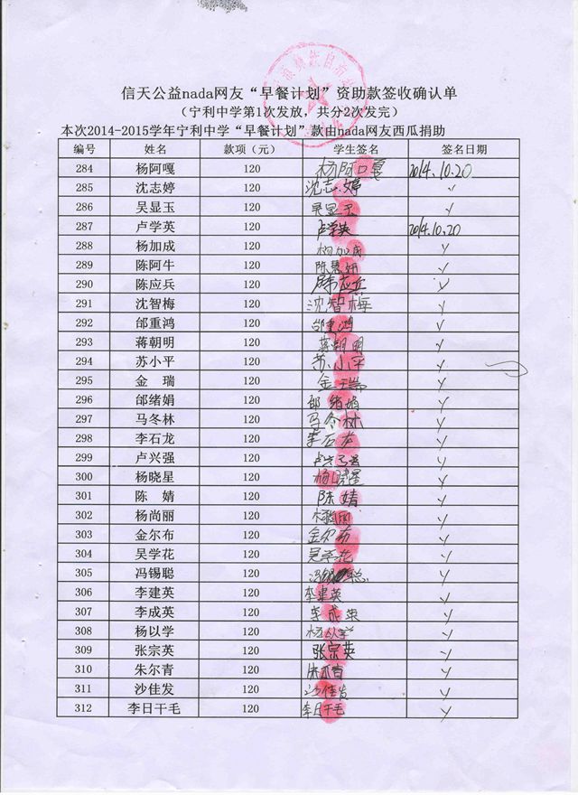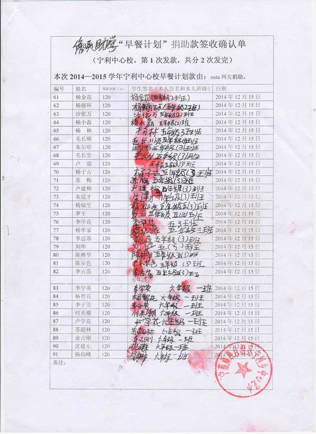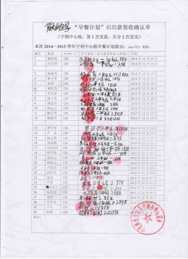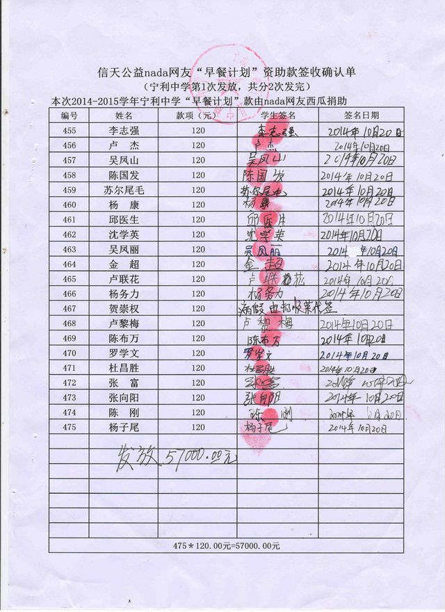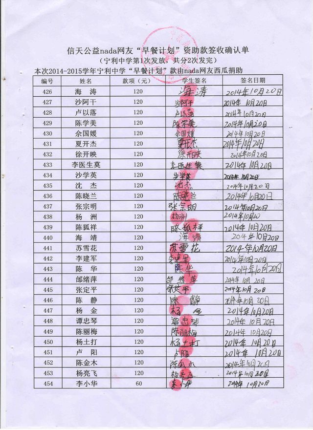 宁利中学,2014-2015年早餐计划第一次发款签收单